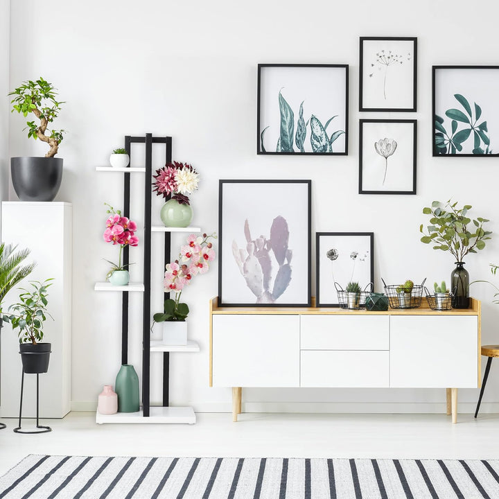 - Materialmix: Stilvolle Pflanzentreppe mit schwarzem Metallgestell und Ablagen in weisser Holzoptik