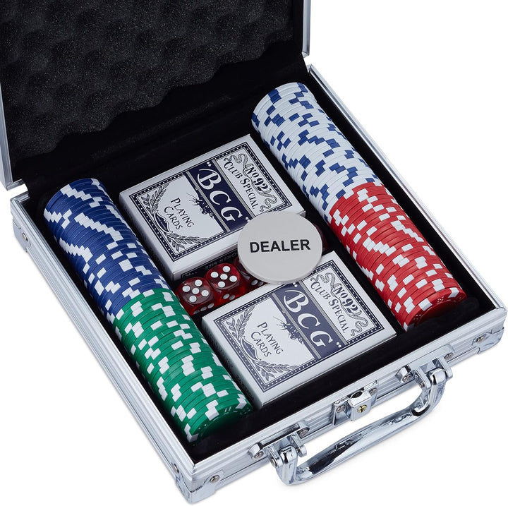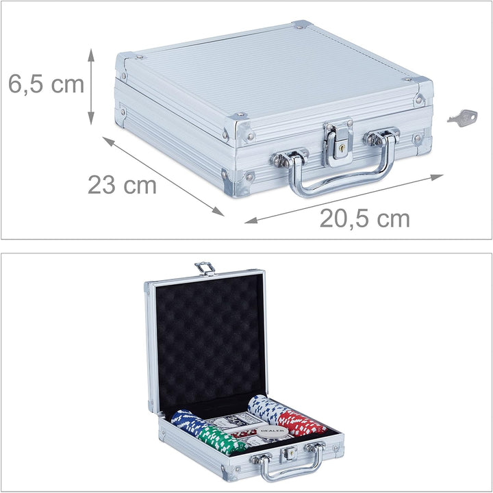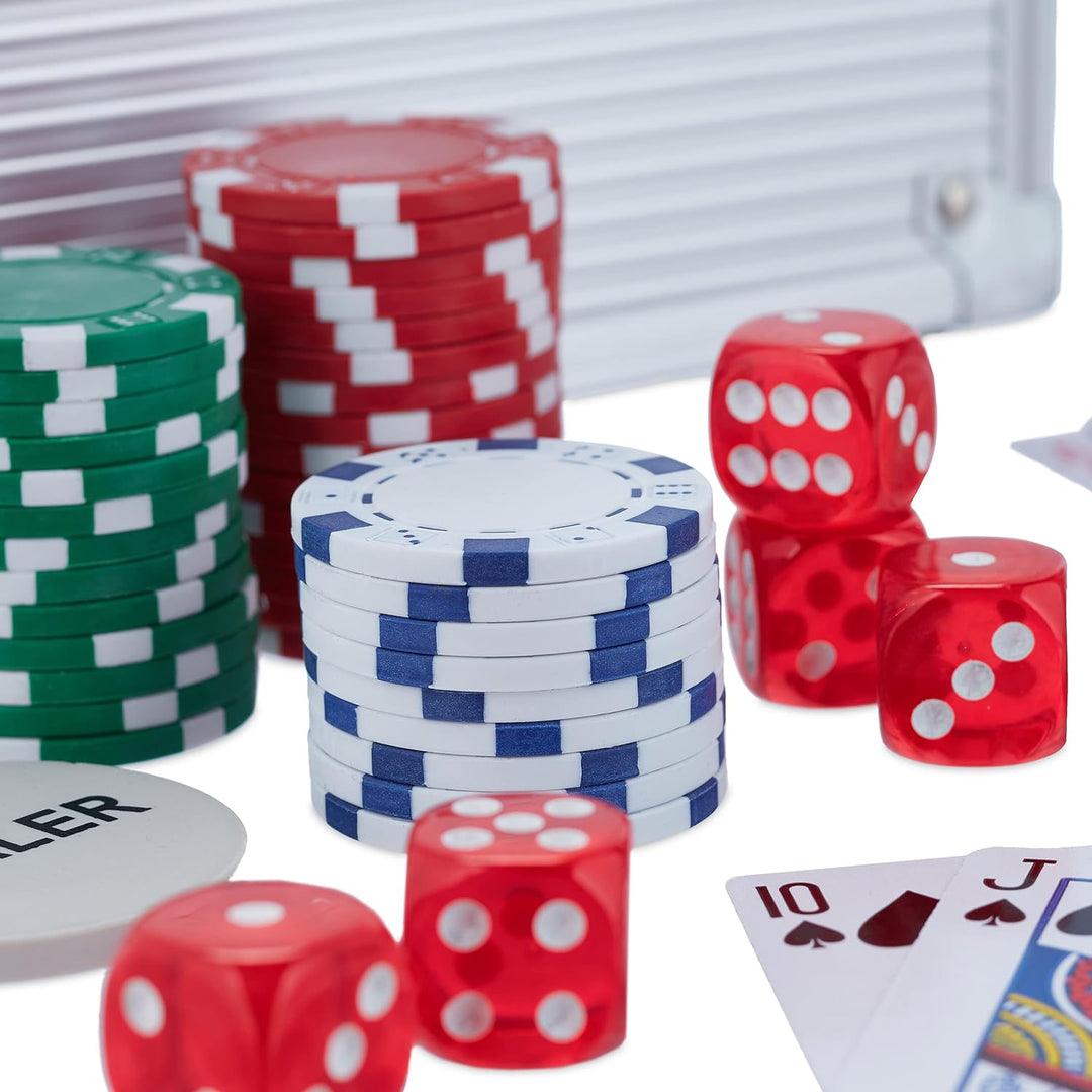 Relaxdays Pokerkoffer, 100 Pokerchips ohne Wert, 2 Kartendecks, 5 Würfel, Dealer-Button, Pokerset, a