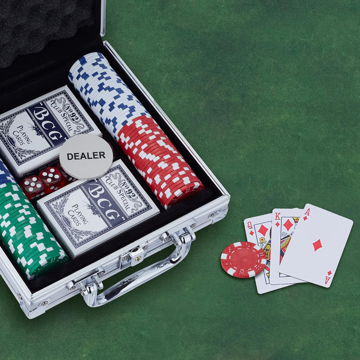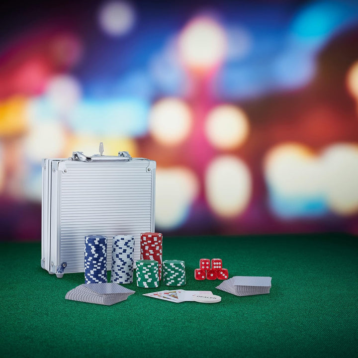 • Zubehör: Pokerset mit 100 Pokerchips ohne Wertaufdruck, 1 Dealer-Button, 5 Würfeln und 2 Kartendecks