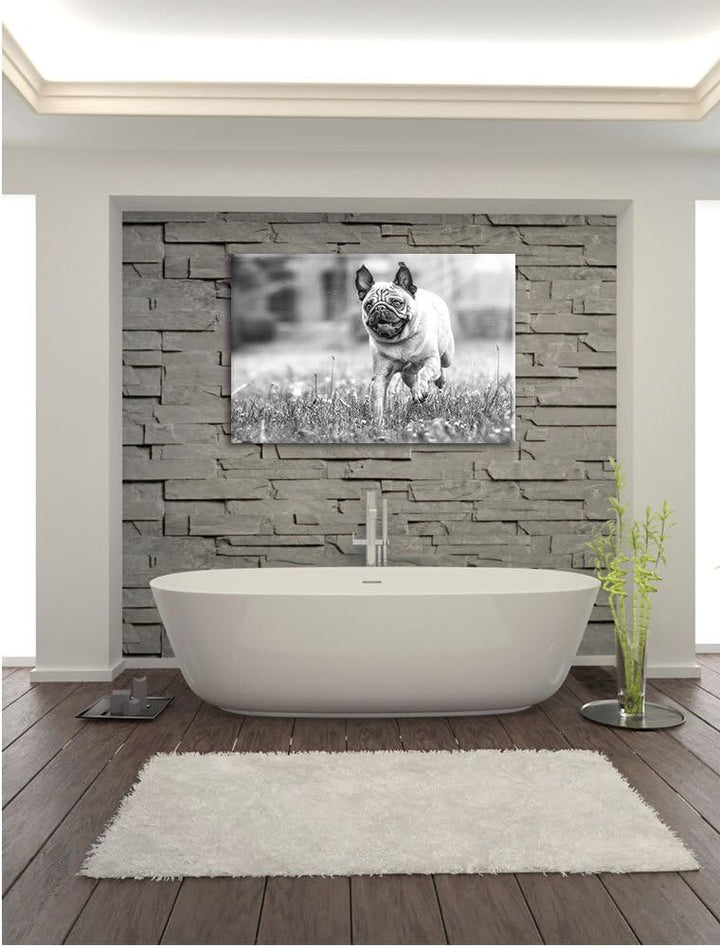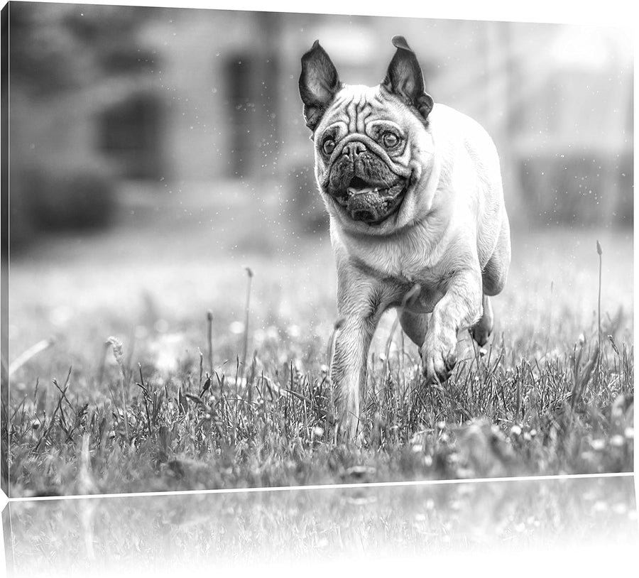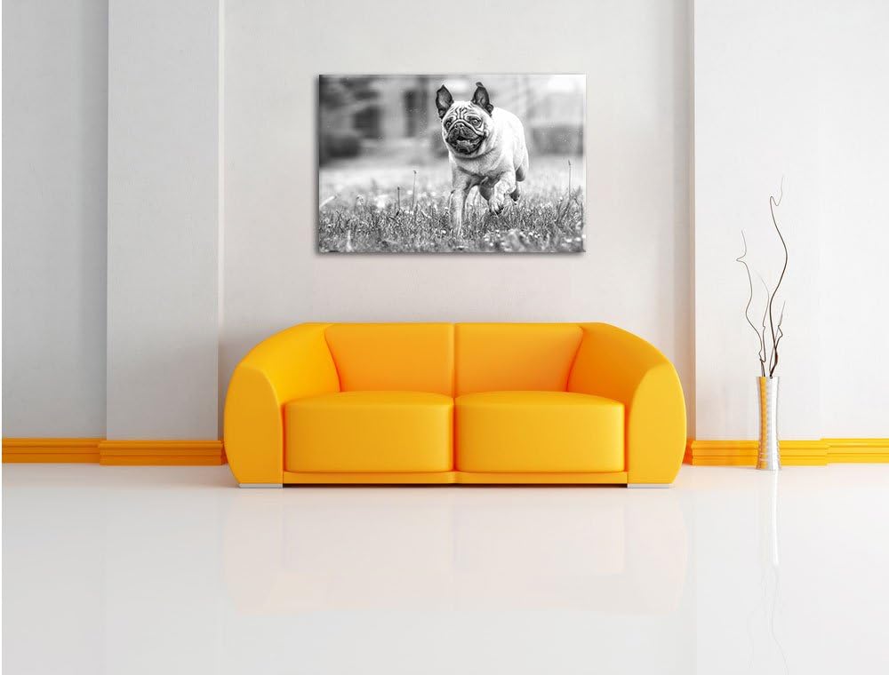 Rennender Mops Kunst B&W, Format: 100x70 auf Leinwand, XXL riesige Bilder fertig gerahmt mit Keilrah
