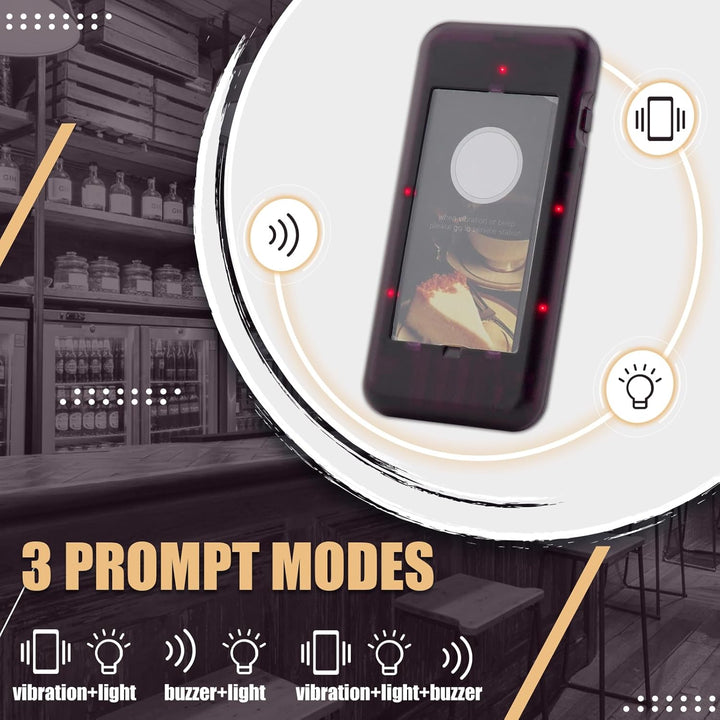 - 3 Arten von Eingabeaufforderungsmodus; Vibration + Blitz; Buzzer + Blinken; Vibration + Summer + Blitz; Sie können die richtige Eingabeaufforderung entsprechend der Umgebung des Restaurants auswählen