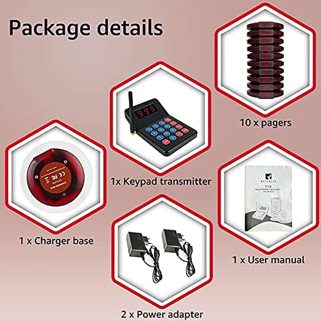 - Optionale Lademethode; jede Ladestation kann 10 Pager aufladen; Jeder Pager verfügt über einen USB-Ladeanschluss; die separat berechnet werden können; es kann auch in einem Stapel geladen werden; das Paket enthielt 2 Adapter
