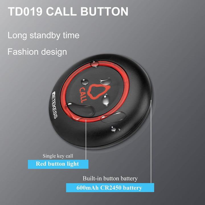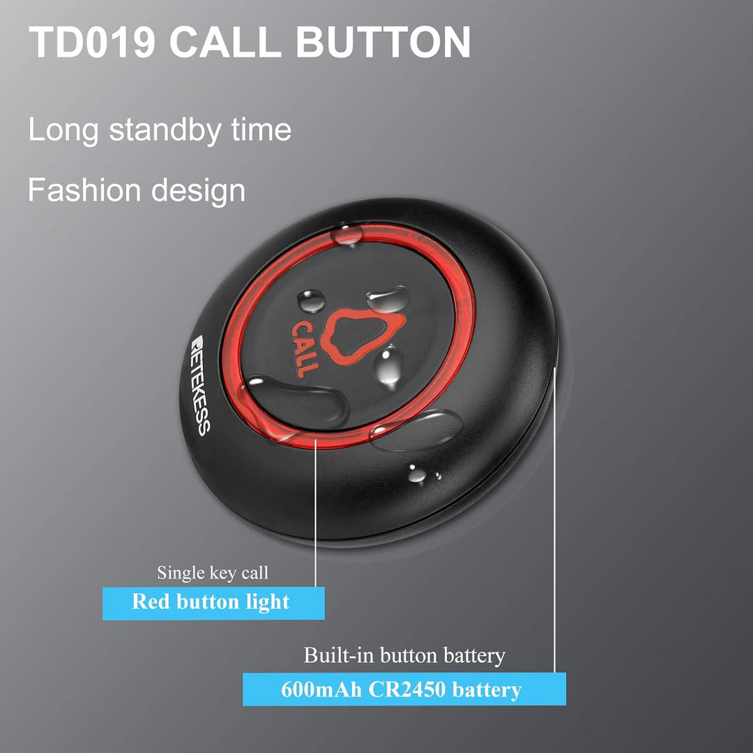- Lange Arbeitszeit; Der Uhrenempfänger verfügt über einen integrierten 300-mAh-Akku; 72 Stunden Standby im Energiesparmodus; Die Pager-Taste TD019 verfügt über einen integrierten 600-mAh-Akku; Die Standby-Zeit beträgt bis zu 1 Jahr; Es kann über