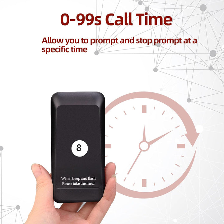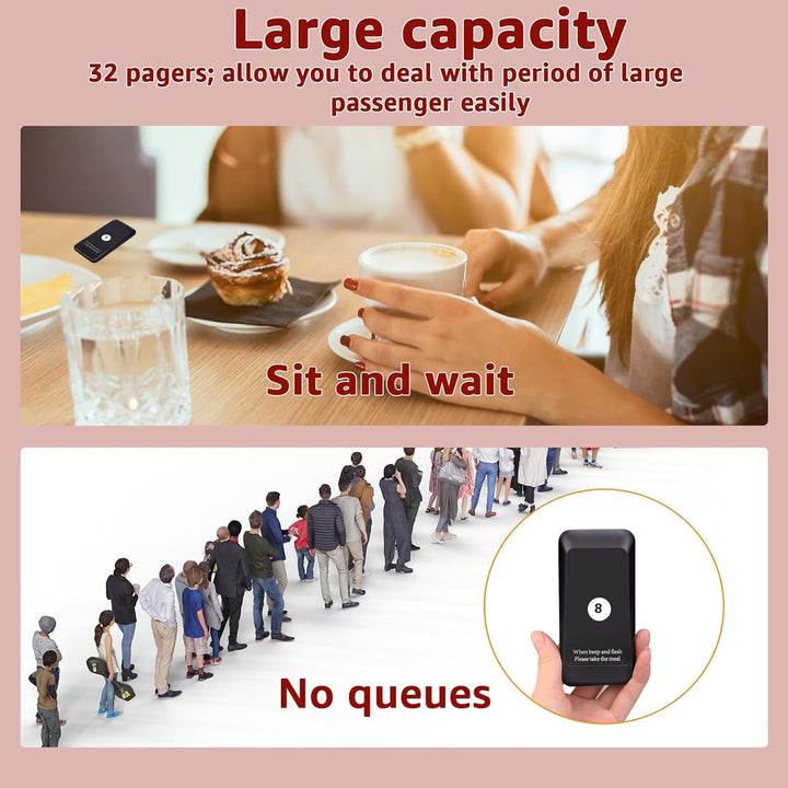 - Grosse Kapazität 32 Pager; ermöglicht es Ihnen, mit Zeitraum von grossen Passagier leicht umgehen; max 998 Pager können als Ihr Geschäft Wachstum hinzugefügt werden