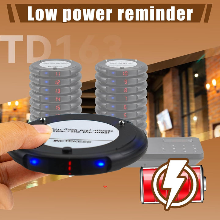 - Weit verbreitet: TD163 gästerufsystem kann Warteschlangen minimieren, Verwirrung reduzieren und die Kundenerfahrung verbessern; weit verbreitet in Restaurants, Hotels, Bars, Krankenhäusern, Food Trucks, Sportvereinen und anderen Orten, an denen