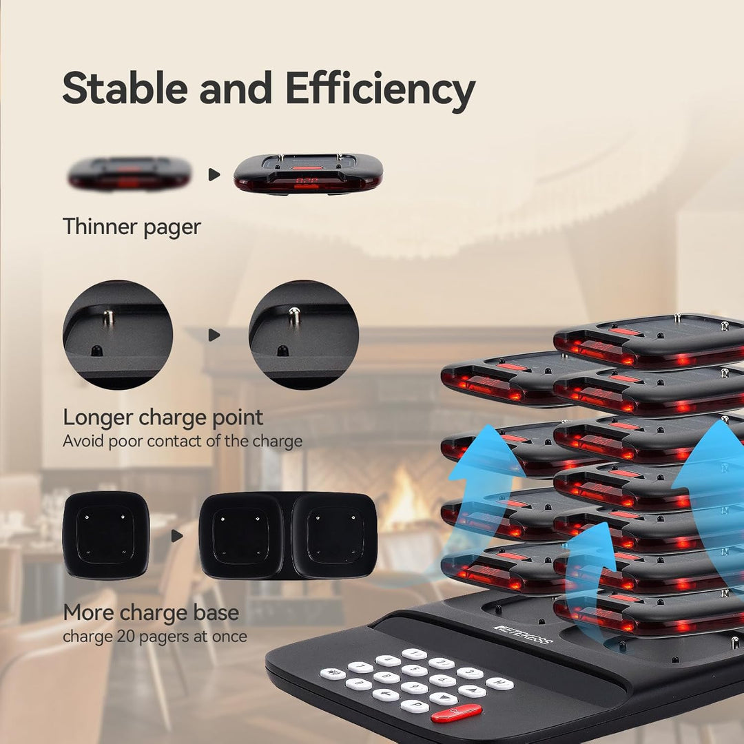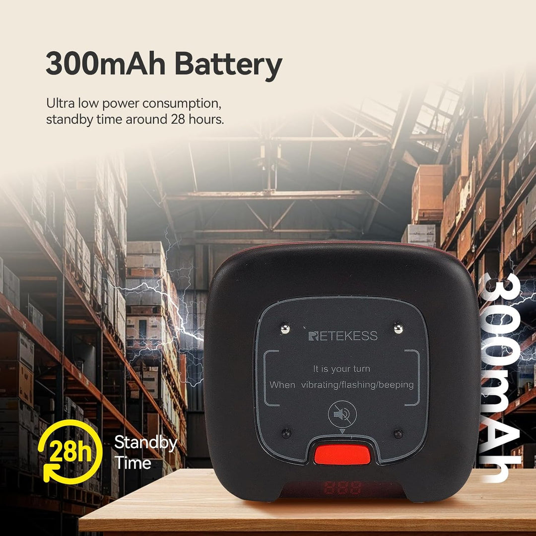 - Jeder Pager verfügt über einen eingebauten 300-mAh-Akku; die Standby-Zeit kann 28 Stunden erreichen und der Pager ist mit Ladeerinnerung und vollständiger Erinnerung ausgestattet