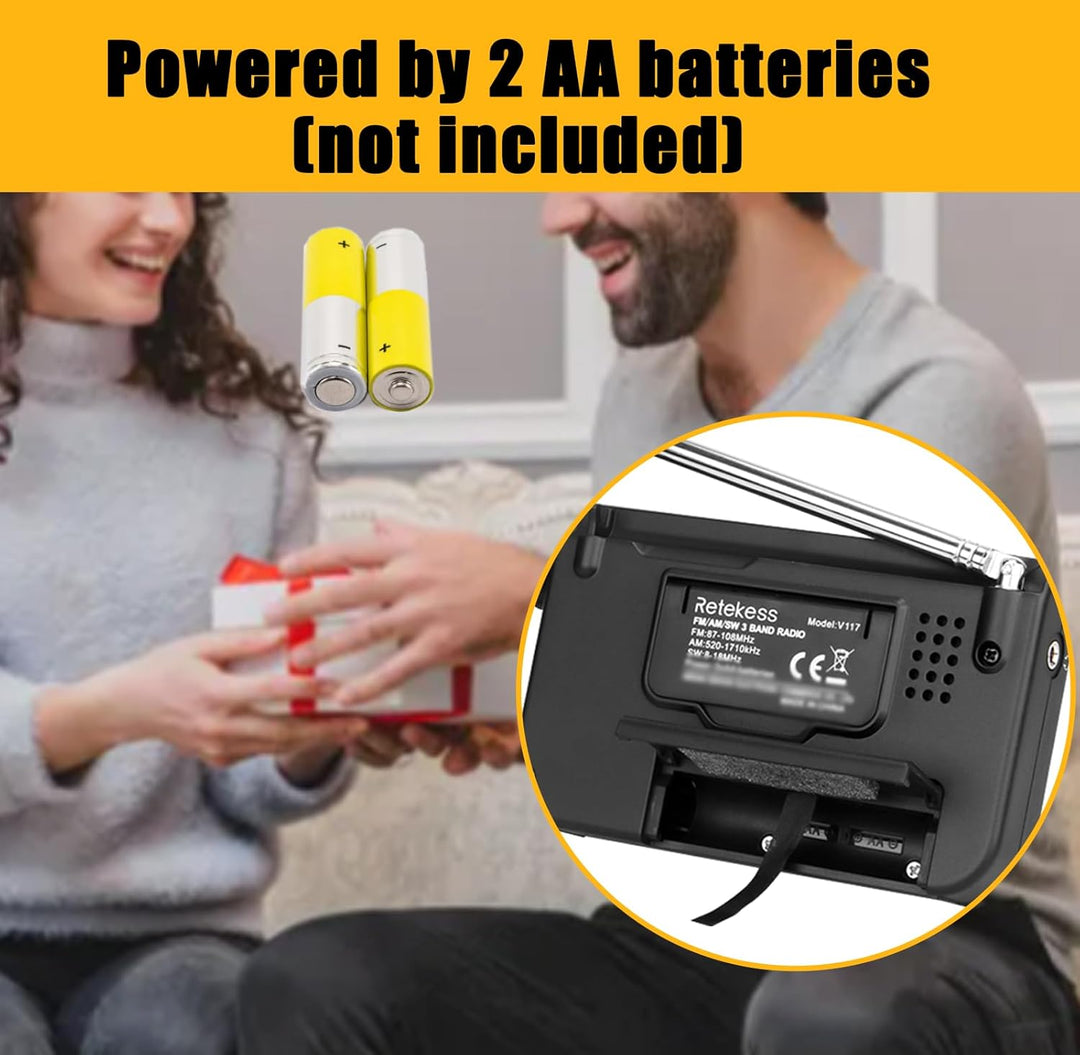 - Das Transistorradio wird mit zwei 1,5-V-AA-Batterien (nicht im Lieferumfang enthalten) betrieben und verfügt über eine LED-Batteriestatusanzeige