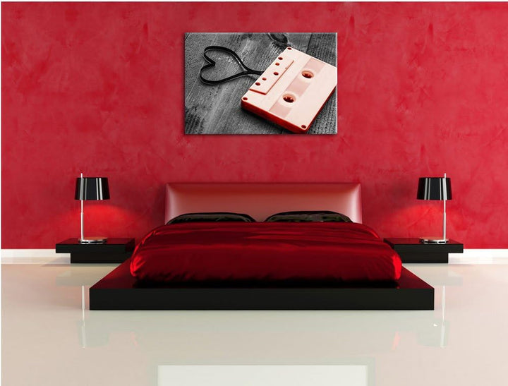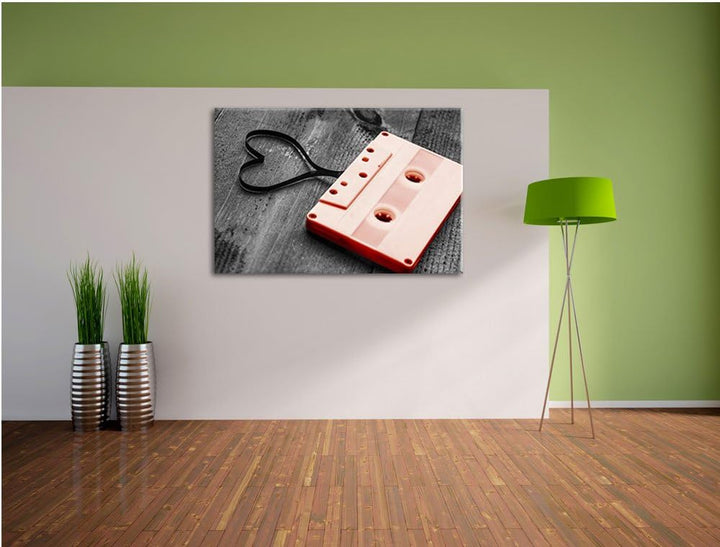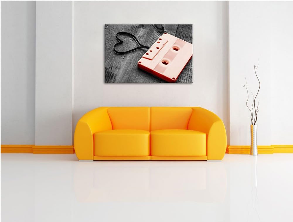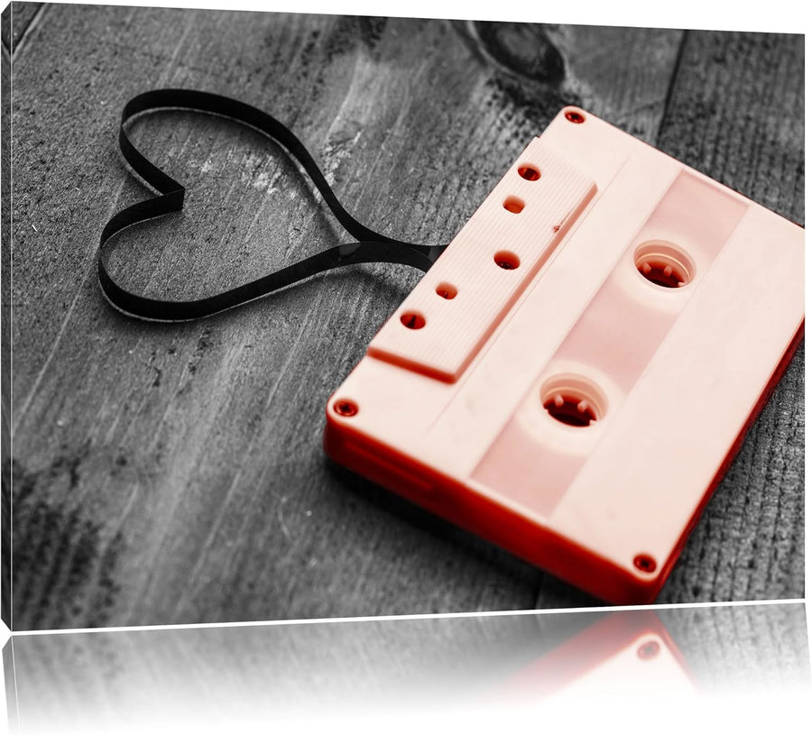 Retro Kasette mit Herz schwarz/weiss Format: 100x70 auf Leinwand, XXL riesige Bilder fertig gerahmt
