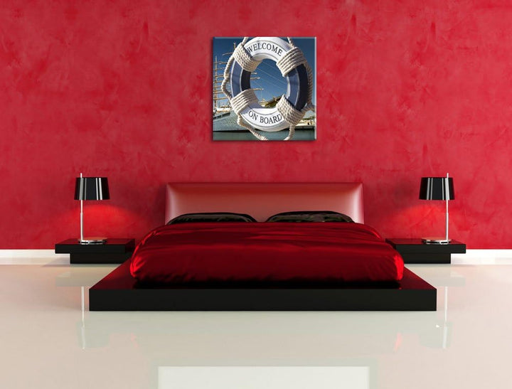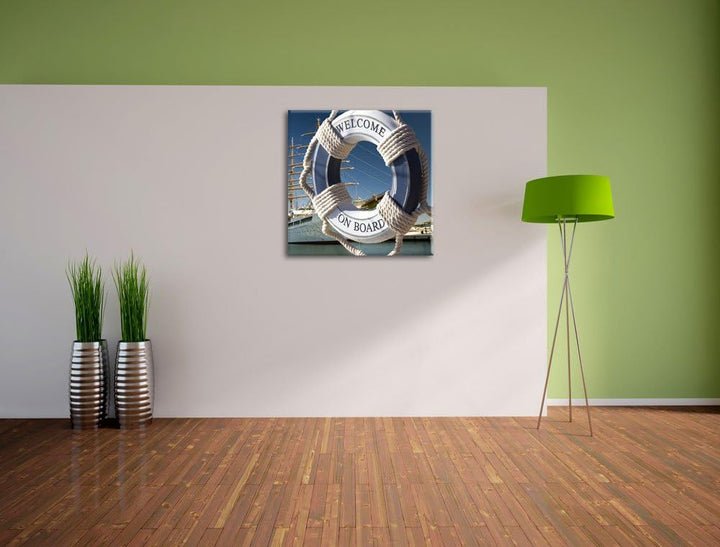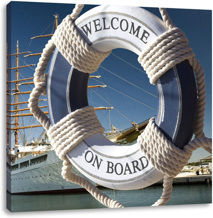 Rettungsring vor Schiff, Format: 70x70 auf Leinwand, XXL riesige Bilder fertig gerahmt mit Keilrahme