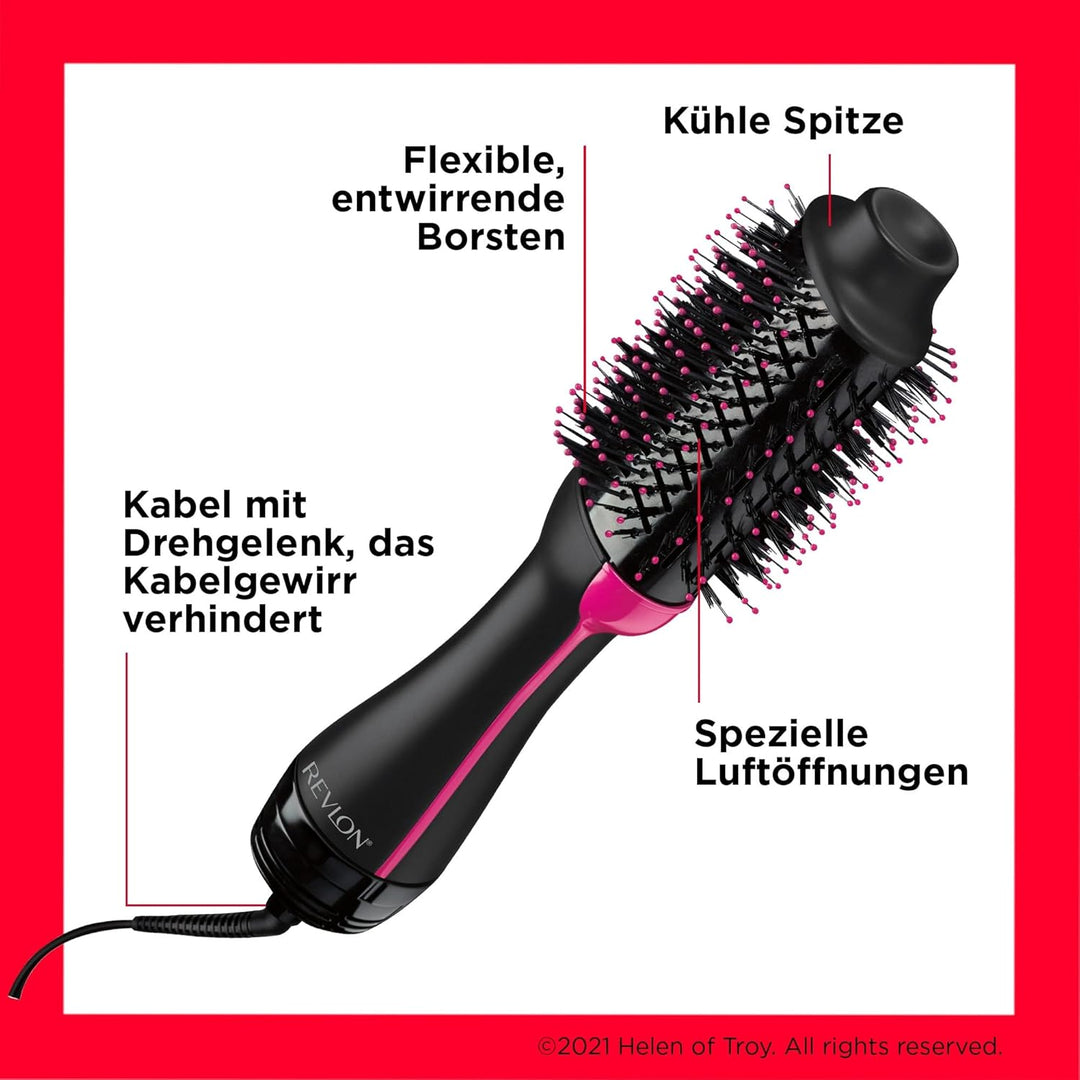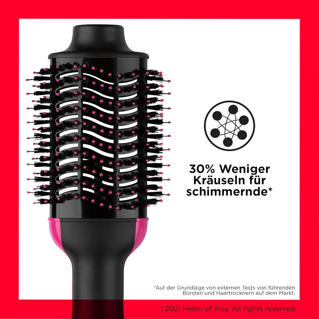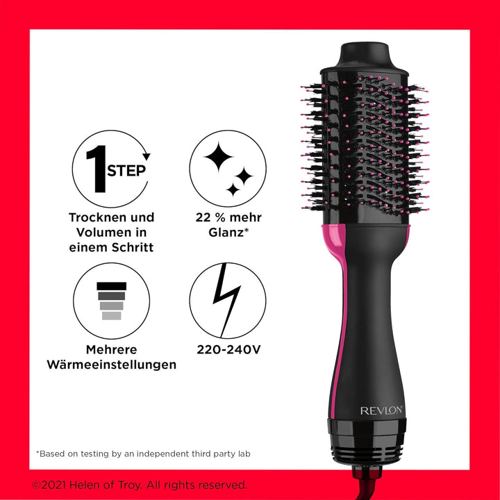 - Kombination aus leistungsstarkem Haartrockner und Volumenbürste.