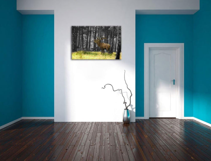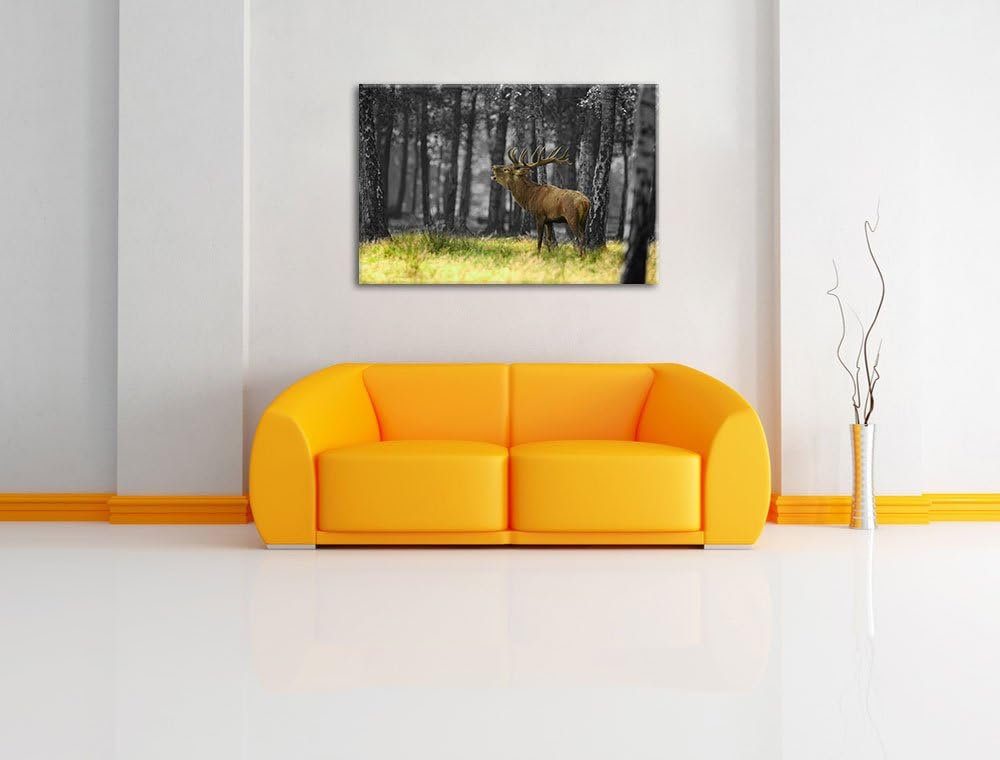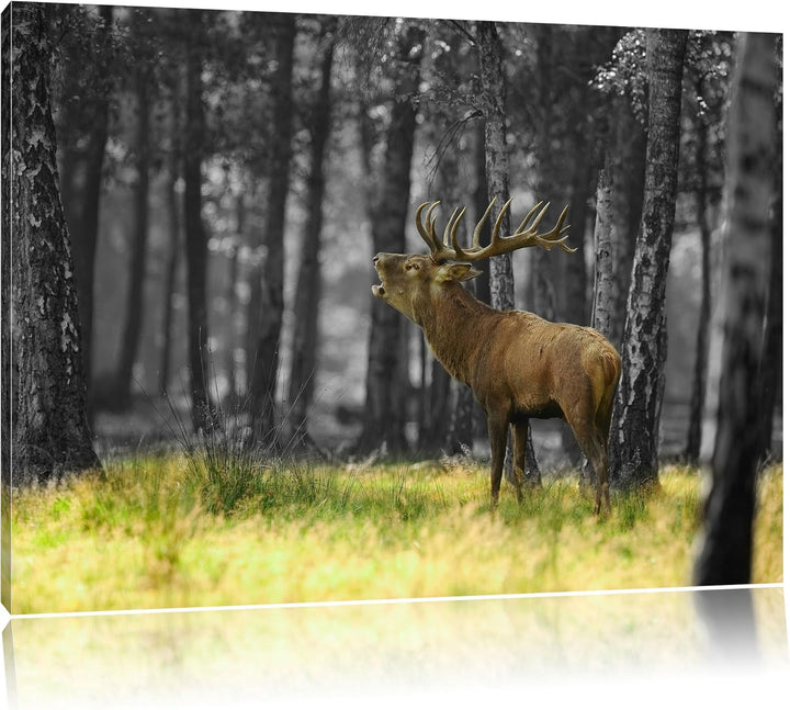 röhrender Hirsch im Wald schwarz/weiss Format: 100x70 auf Leinwand, XXL riesige Bilder fertig gerahm