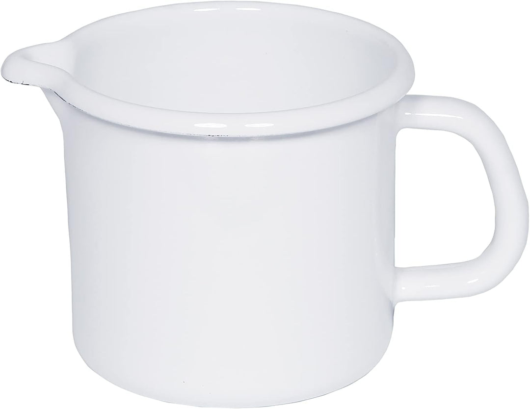 • aus klassisch weisser Emaille, in fünf Grössen erhältlich von 0,5 l bis 2 l