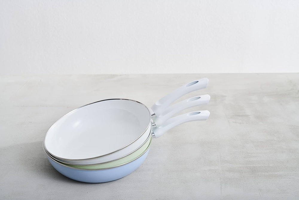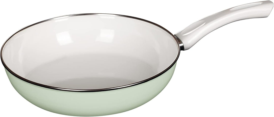 - Pfanne aus Emaille, Kunststoffgriff weiss, Farbe grün aussen – innen weiss