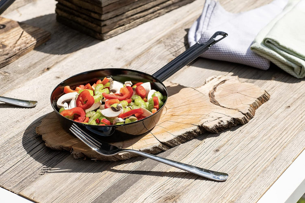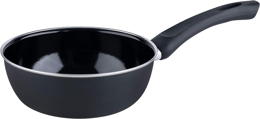 - extra hohe Pfanne aus Schwarzemaille, 20 cm, Kunststoffgriff schwarz, innen und aussen schwarz