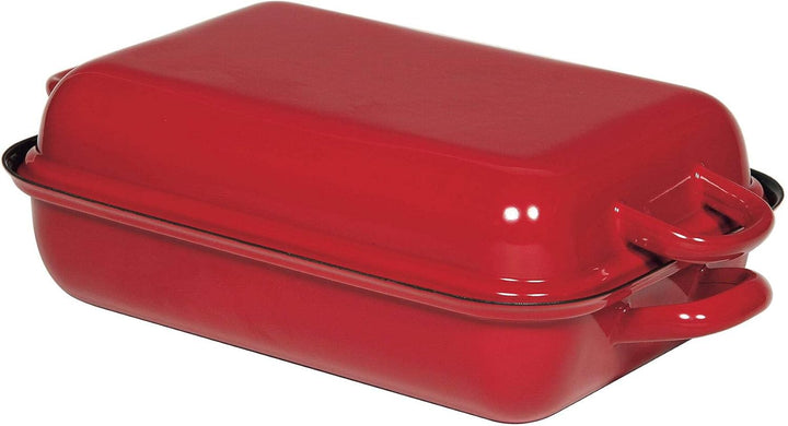 - Innenmasse 31×21 cm, Aussenmasse 38,5×21,8 cm, gut schliessender Deckel mit Griff, der ebenfalls als Bratform dienen kann, Color Rot