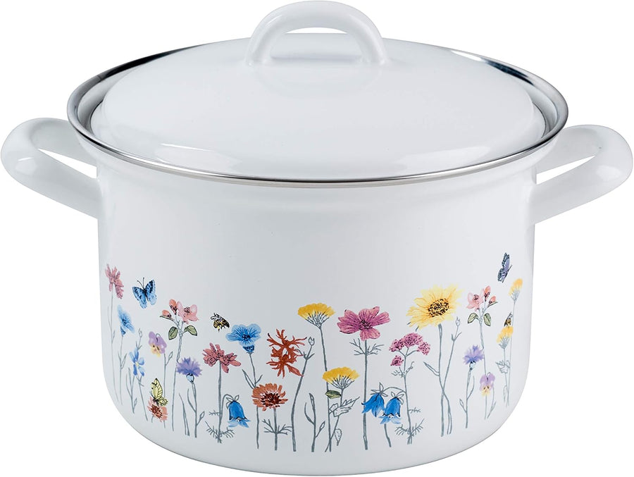 - hoher Fleischtopf mit zwei Emaillegriffen, hohe Seitenwand, robuster Chromrand, Deckel mit Griff