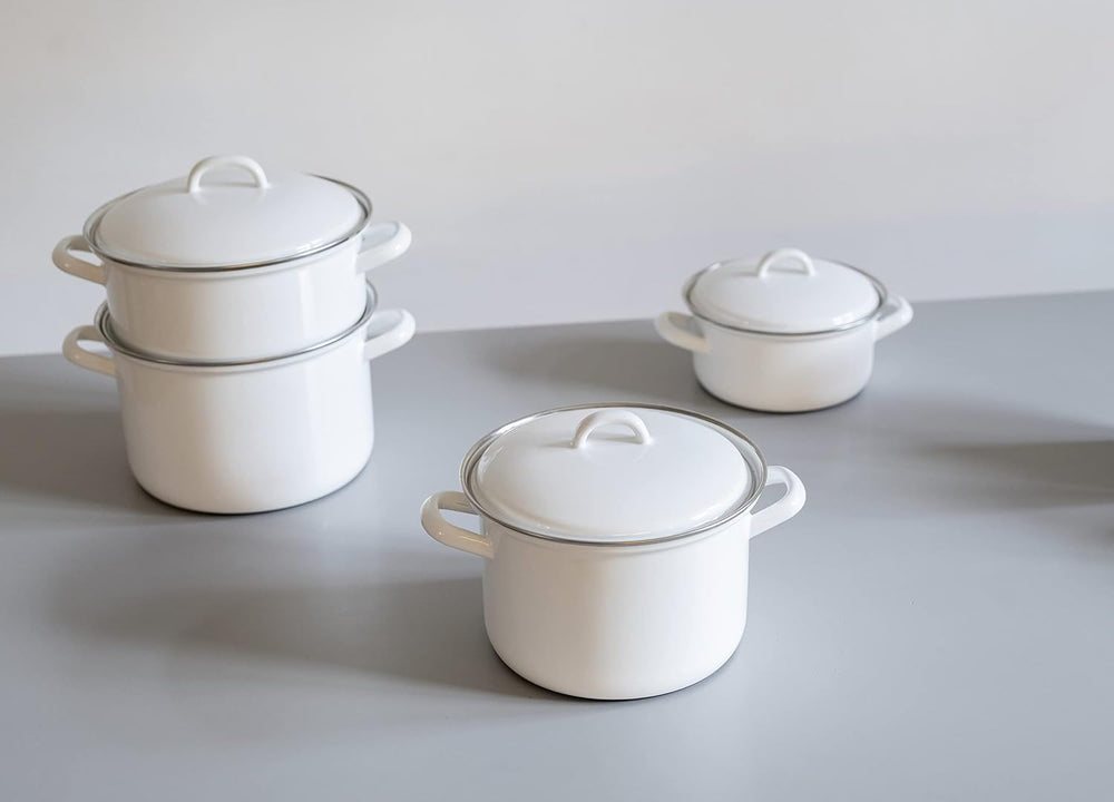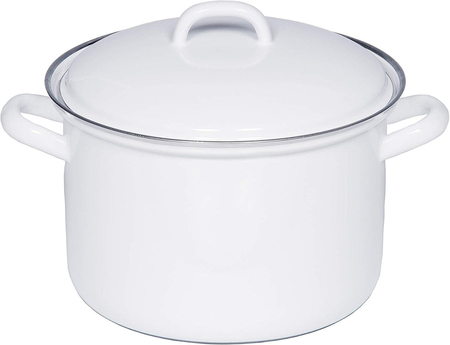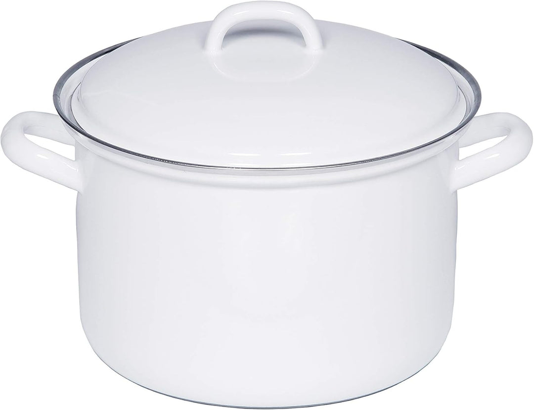 - hoher Fleischtopf mit zwei Emaillegriffen, hohe Seitenwand, robuster Chromrand
