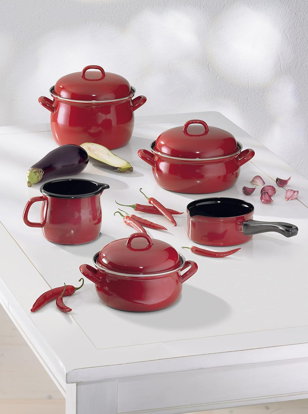 - Kasserolle aus Emaille mit zwei Emaillegriffen, Emaille-Deckel mit Griff, halbhohe Seitenwand, robuster Chromrand