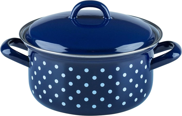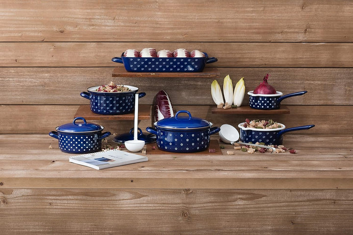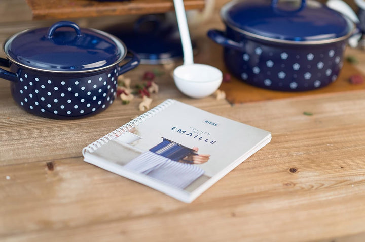 - Kasserolle aus Emaille mit zwei Emaillegriffen, Emaille Deckel mit Griff, halbhohe Seitenwand, robuster Chromrand