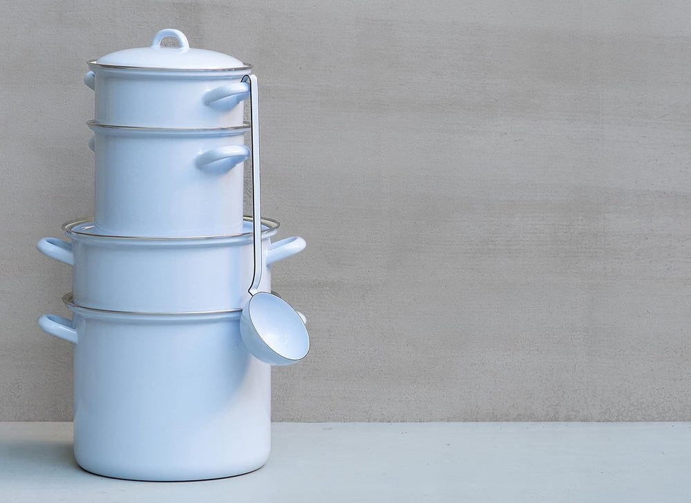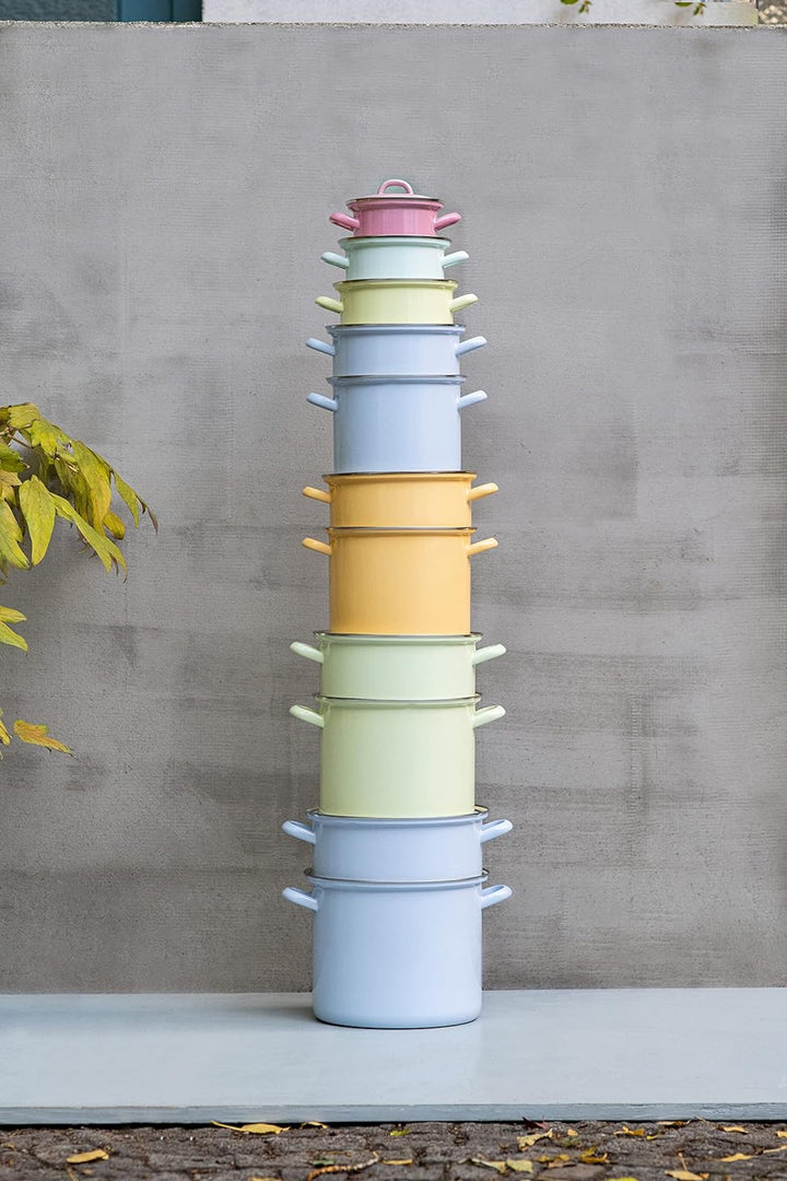 - hoher Fleischtopf mit zwei Emaillegriffen, hohe Seitenwand, robuster Chromrand, Deckel mit Griff optional