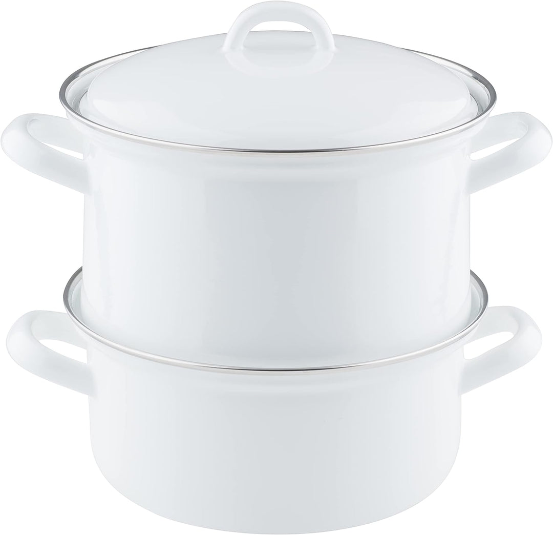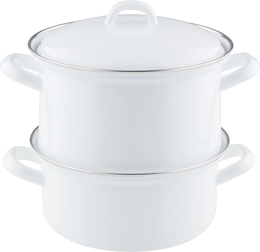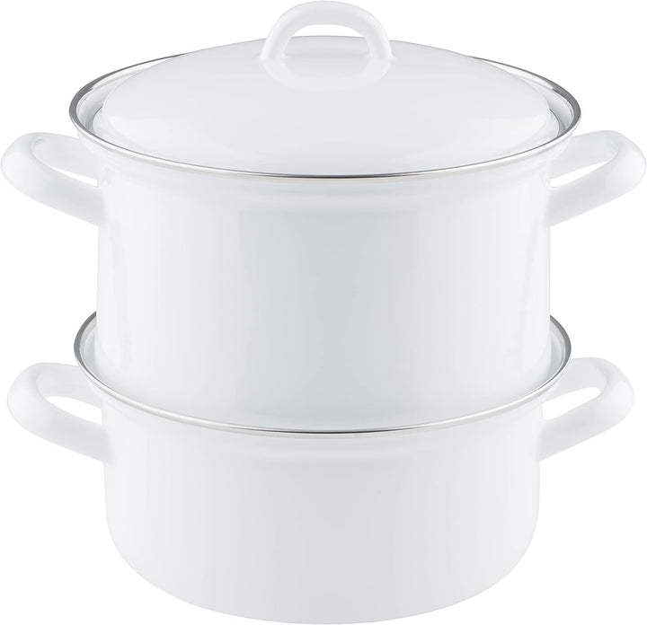 - Dreiteiliger Kartoffelkocher aus Emaille, besteht aus Topf, Topfaufsatz mit gelochtem Boden und Deckel, vier Haltegriffe aus Emaille