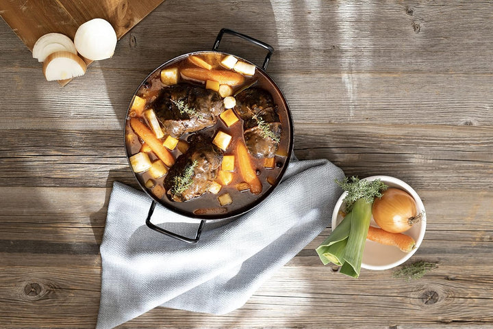 - runde Pfanne mit zwei Serviergriffen, hoher Rand