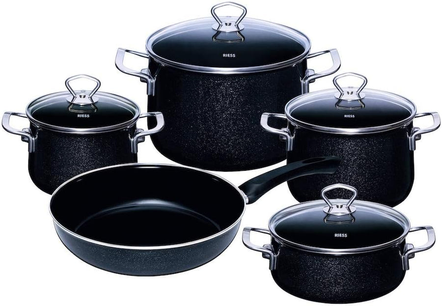 - Geschirrset aus fünf Teilen, Design-Edelstahlgriff, Sichtglasdeckel mit Edelstahlgriff, extra starker Stahl-Wärmespeicherboden, robuster Chromrand