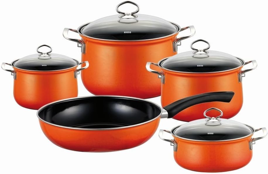 Riess, 0558-034, Emailleset 5-teilig, NOUVELLE, CORALL, bestehend aus: Fleischtopf mit Glasdeckel 16