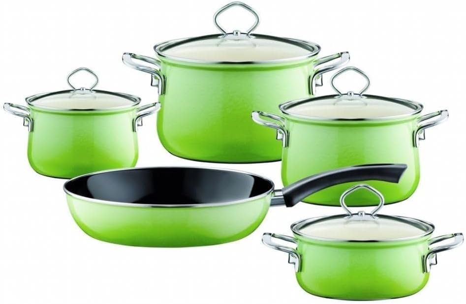 - Geschirrset aus fünf Teilen Fleischtöpfe (16, 20 und 24 cm), Kasserolle (20 cm), Bratpfanne mit Kunststoffgriff, Design-Edelstahlgriff