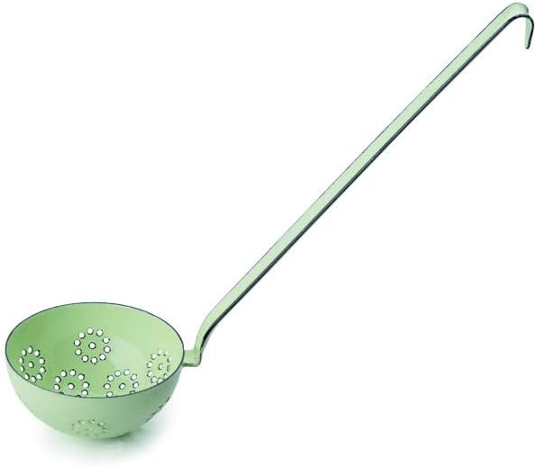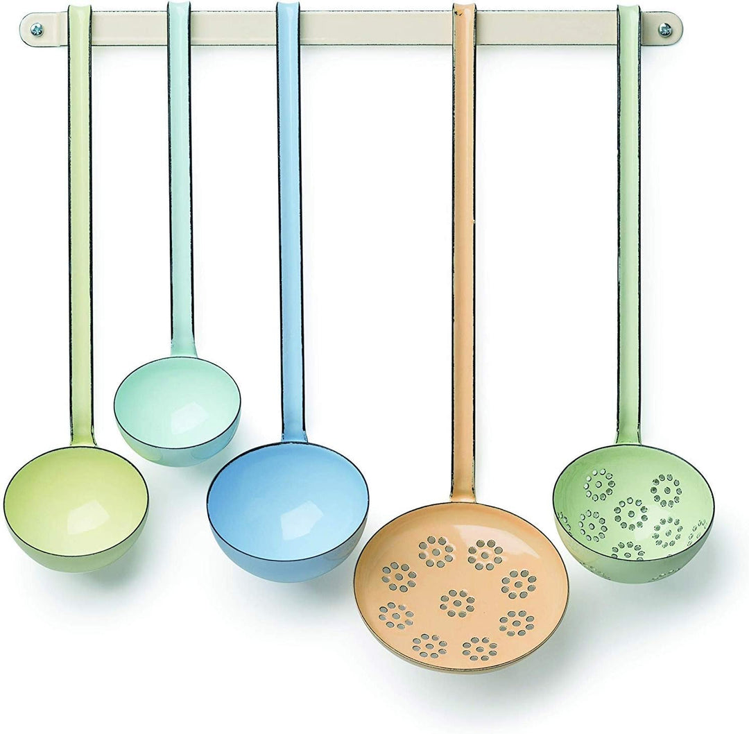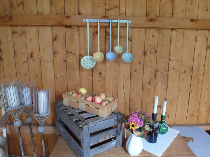 - Dieses Set aus hochwertiger Emaille besteht aus drei Schöpfkellen (7 + 8 + 9 cm), einem Schaumlöffel (9 cm), einer Backschaufel (12 cm) und einer Aufhänge-Löffelblechleiste (38 cm).