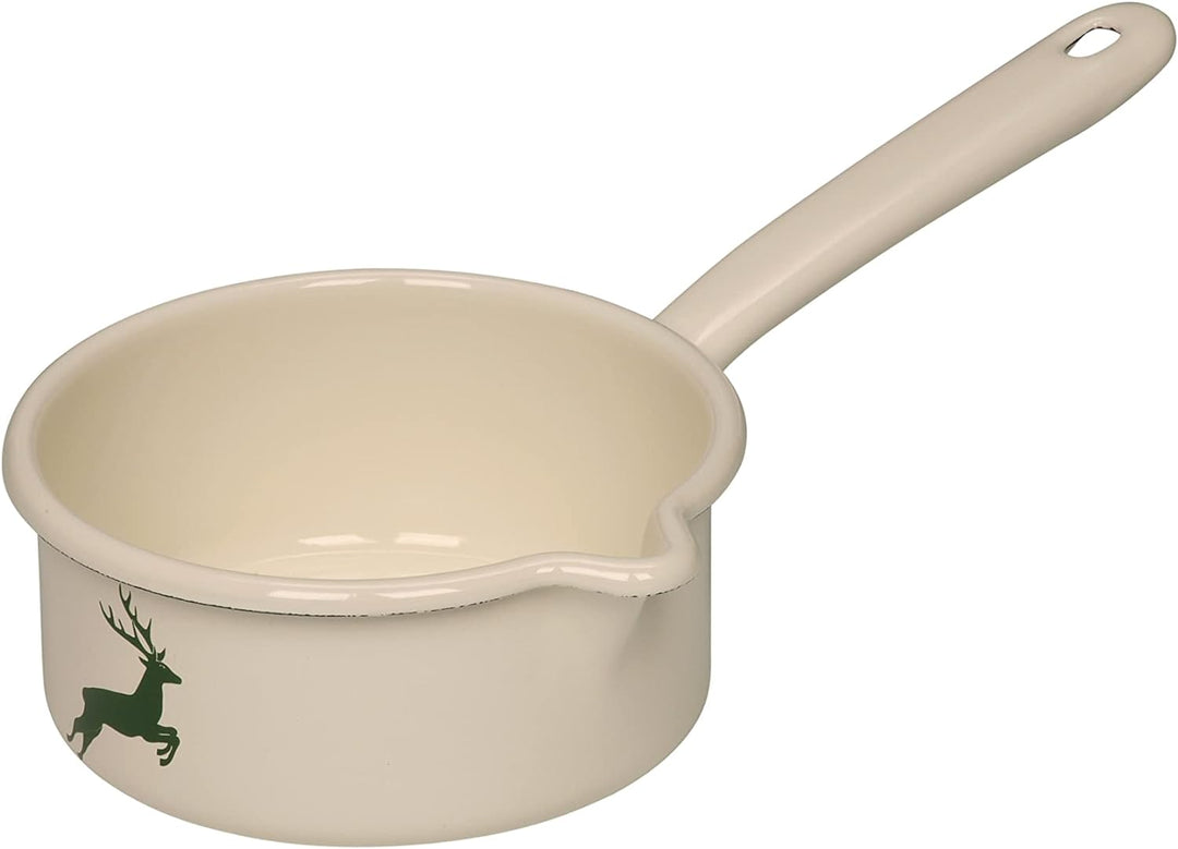 - Stielkasserolle mit Ausguss, Bördelrand, Haltegriff aus Emaille mit Loch zum Aufhängen
