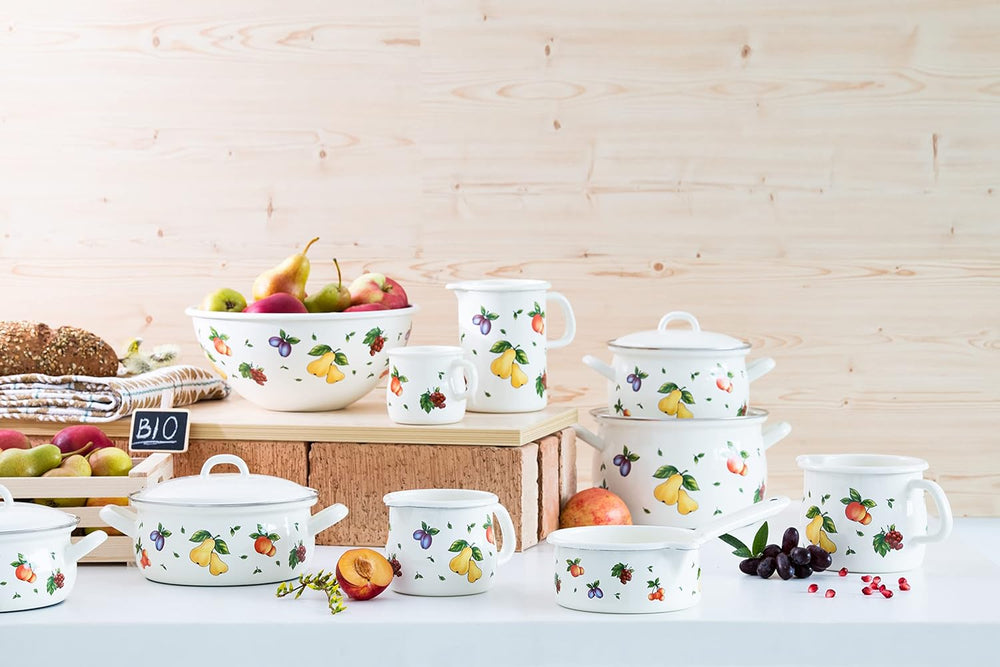 - Ausguss „Schnabel“ zum Ausgiessen von Flüssigkeit, Bördelrand, Inhalt 1,0 Liter, Dekor Fruit Garden