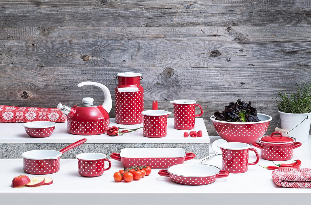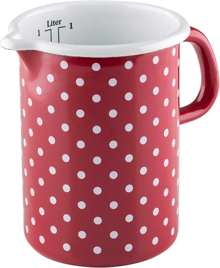 - Ausguss „Schnabel“ zum Ausgiessen von Flüssigkeit, Bördelrand, Inhalt 0,5 Liter, Dekor Pünktchen Rot