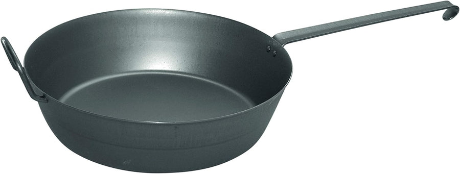 - Kaltgeschmiedete Eisenpfanne mit langem Eisenstiel, Gegengriff zum leichteren Hantieren, gibt es in 32 und 40 cm Durchmesser