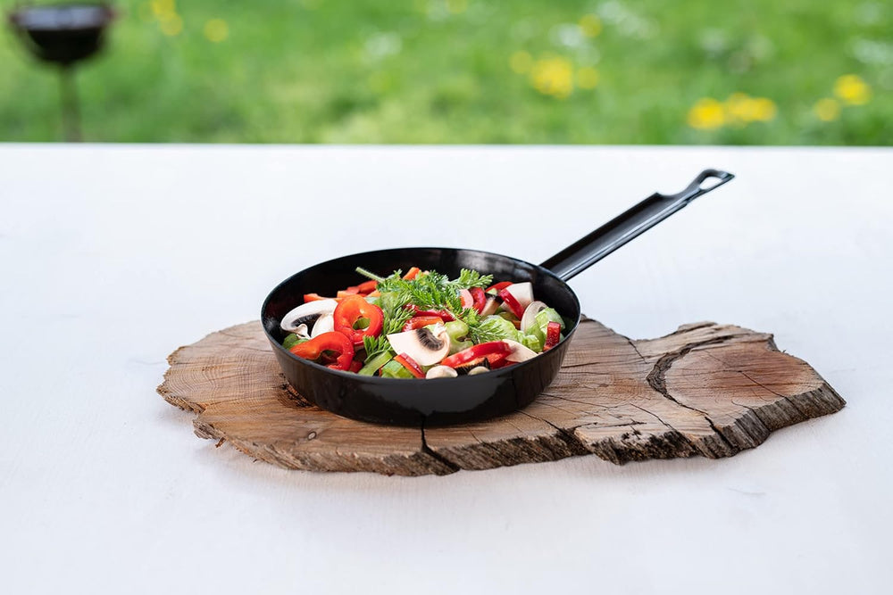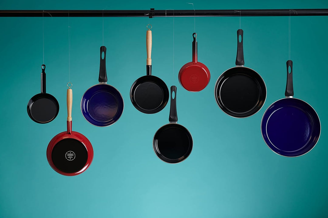 - Emaillepfanne in klassischer Form, Pfannengriff aus Emaille mit Loch zum Aufhängen