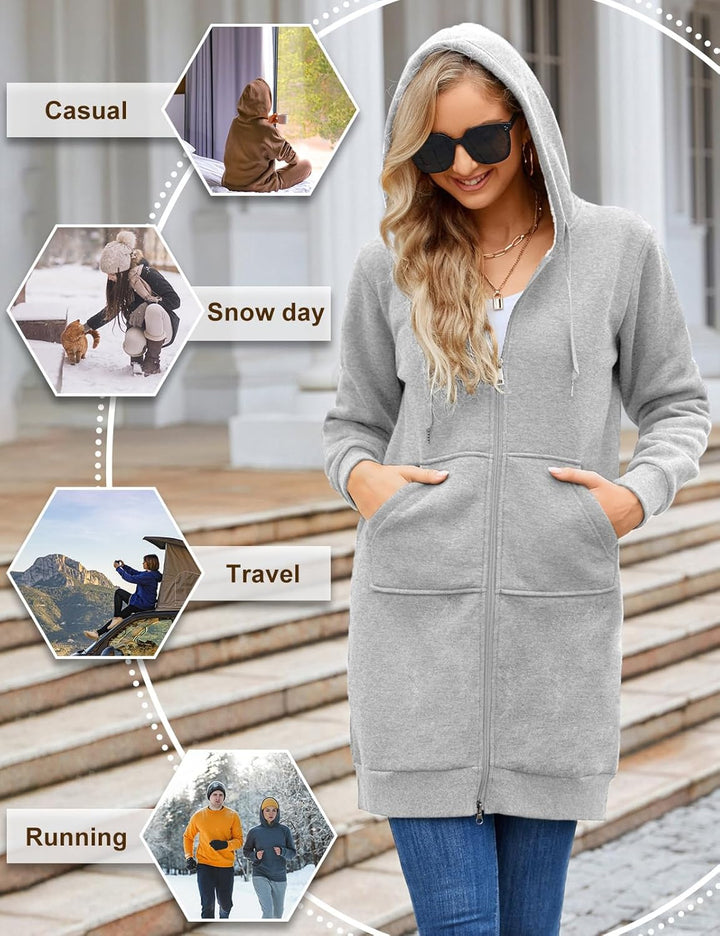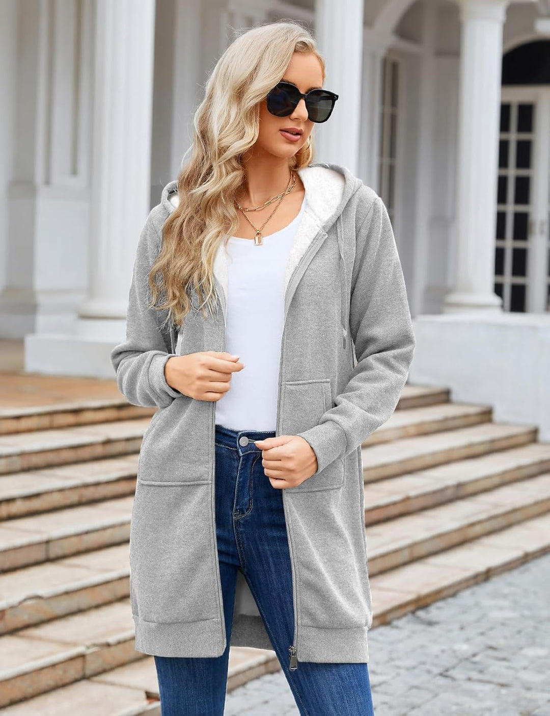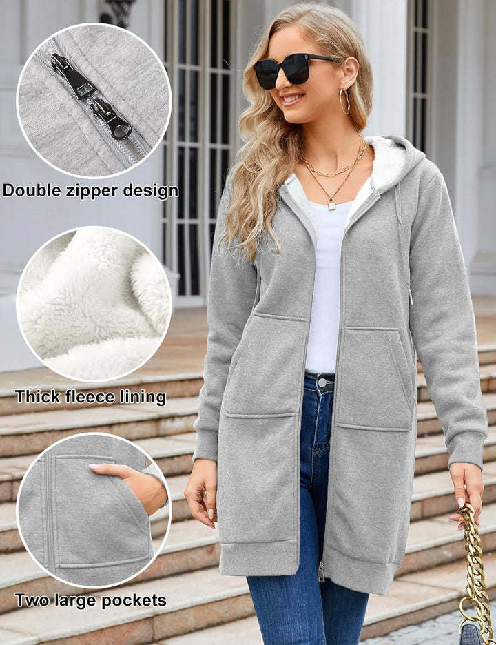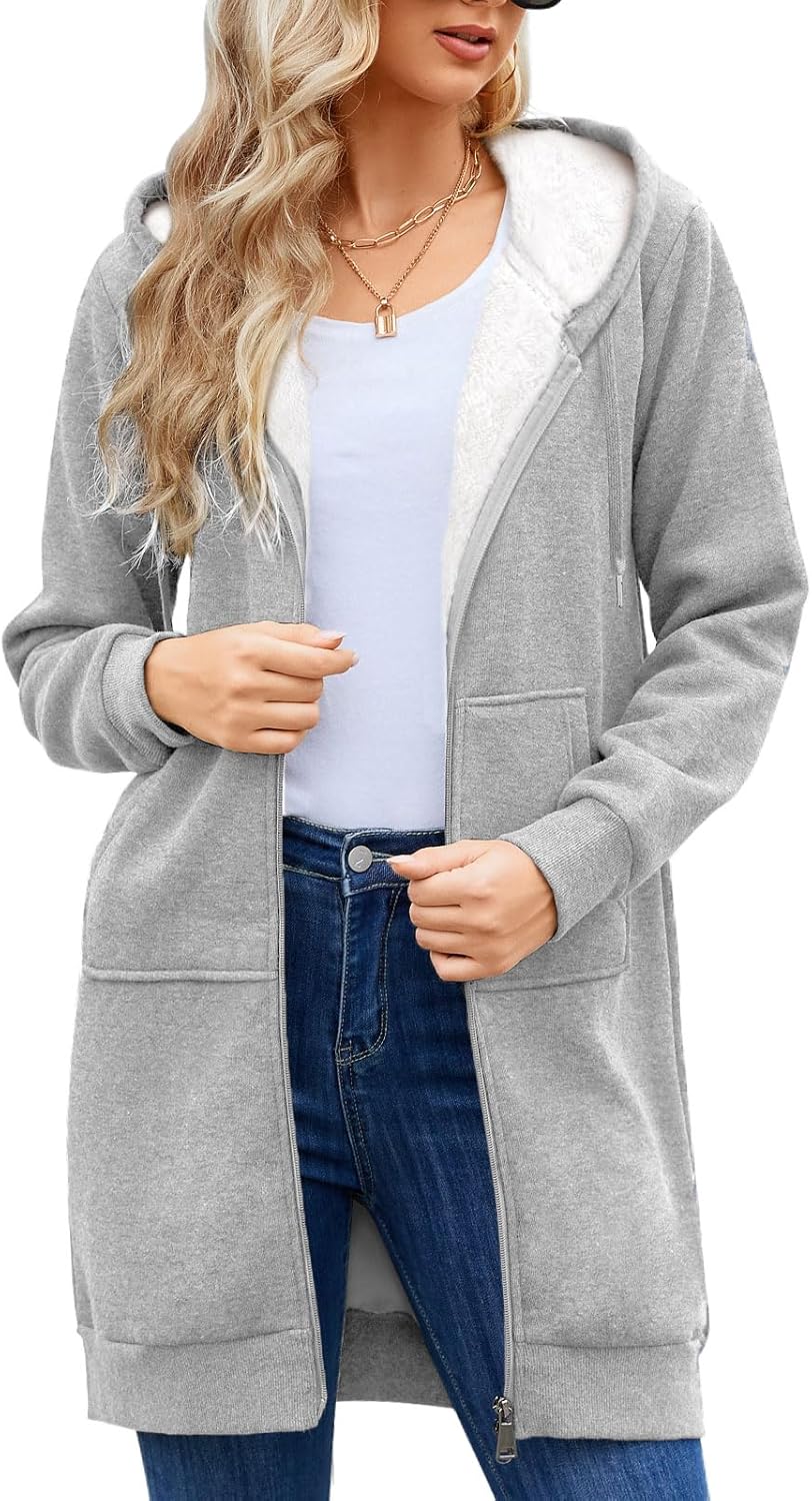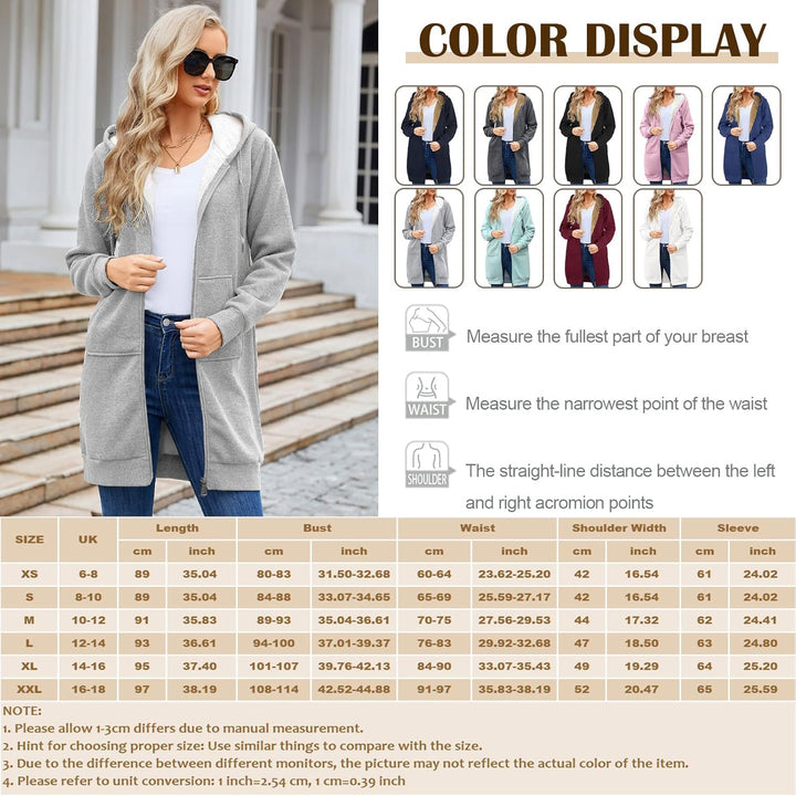 - 【Eigenschaften】: Mittellanger Kapuzenmantel mit durchgehendem Reissverschluss zum einfachen An- und Ausziehen; riesige Kapuze und Taschen halten Kopf und Hände warm; weicher und warmer Hoodie damen mit Fleecefutter und zwei warmen Eingrifftaschen,