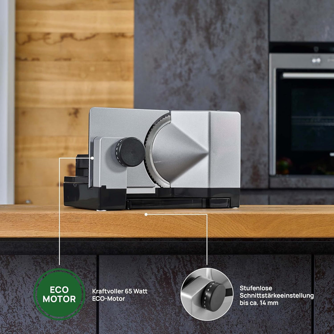 - Lieferumfang: Allesschneider silbermetallic mit Wellenschliffmesser, Schneidgut-Auffangschale, Schneidgutschlitten, Restehalter, Bedienungsanleitung