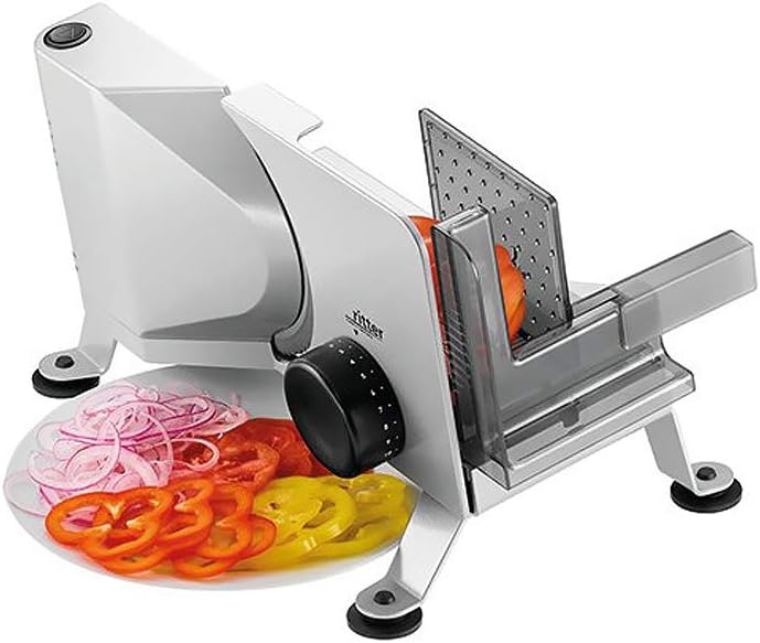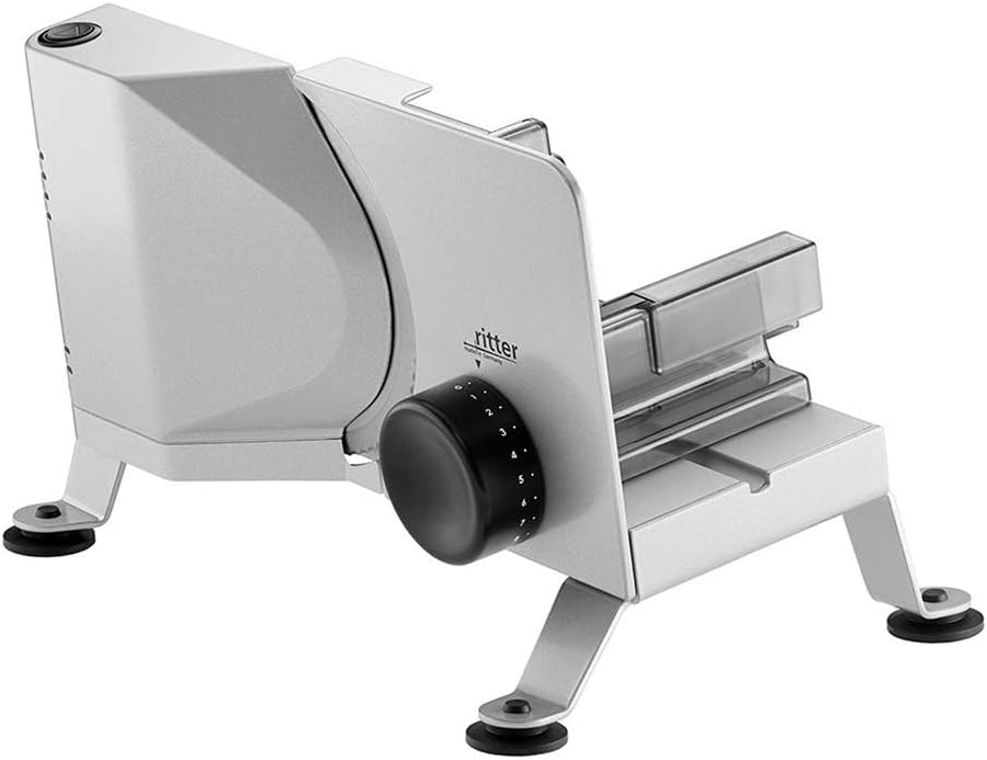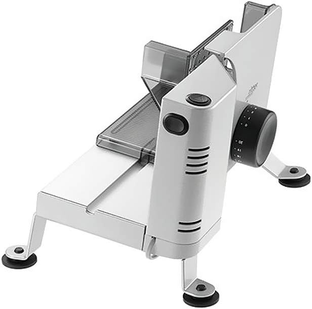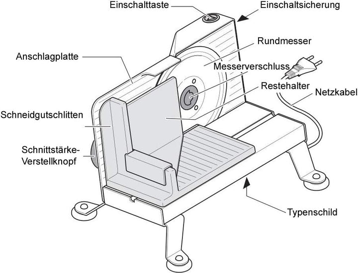 - Lieferumfang: Allesschneider silbermetallic mit Wellenschliffmesser, Schneidgutschlitten, Restehalter, Bedienungsanleitung