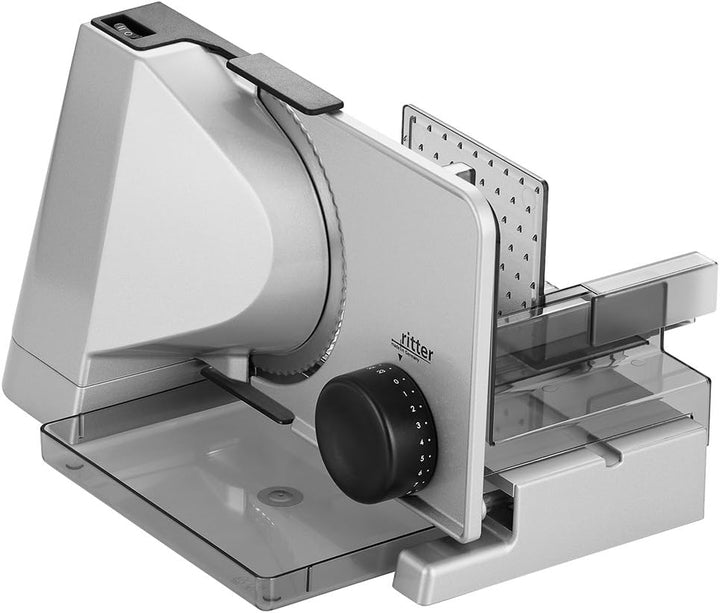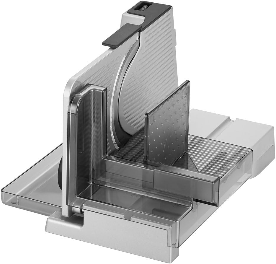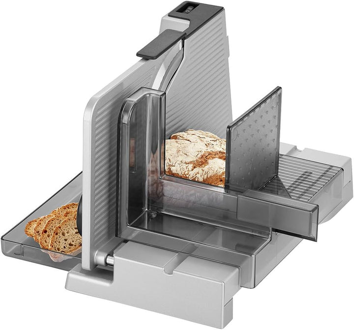 - Lieferumfang: Allesschneider silbermetallic mit Wellenschliffmesser, Schneidgut-Auffangschale, Schneidgutschlitten, Restehalter, Bedienungsanleitung