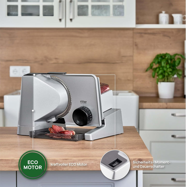 - Lieferumfang: Allesschneider silbermetallic mit Wellenschliffmesser, Schneidgut-Auffangschale, Leichtlaufschlitten, Restehalter, Bedienungsanleitung