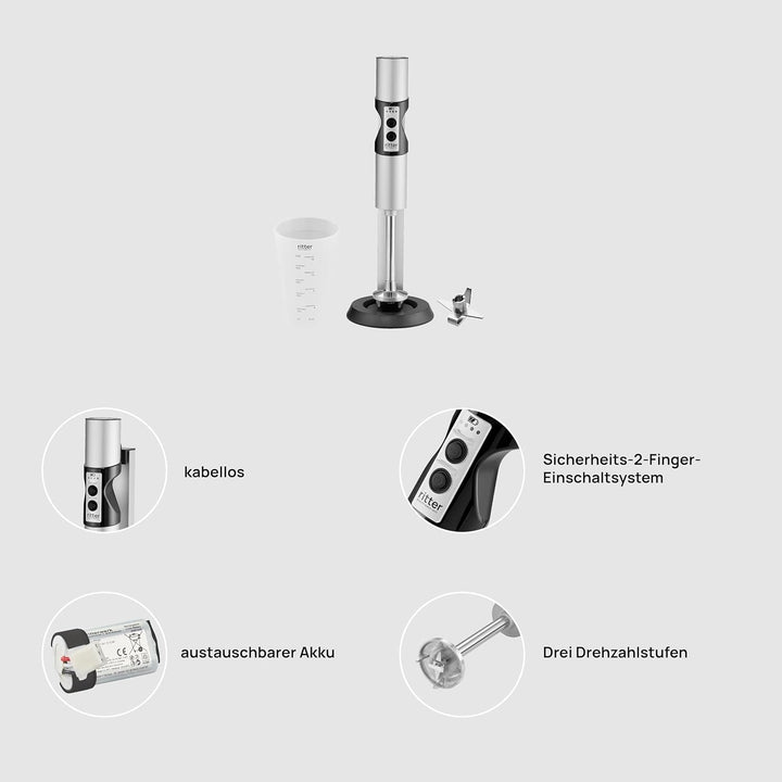 - Lieferumfang: Kabelloser, akkubetriebener Stabmixer silber, 1x Universalmesser aus Edelstahl, Mixbecher aus Kunststoff, Ladestation, Steckernetzteil, Bedienungsanleitung