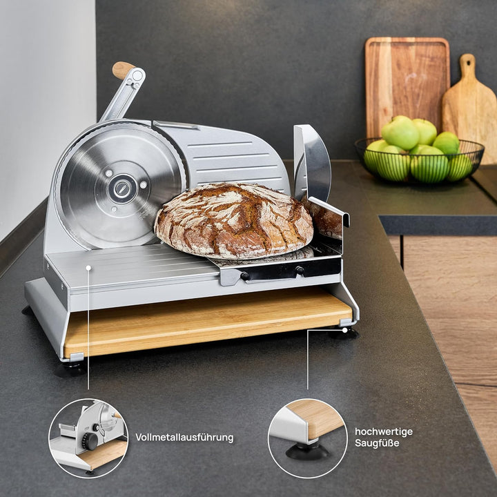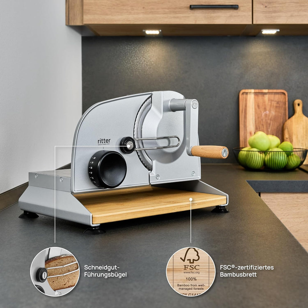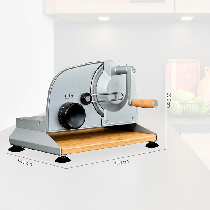 - Lieferumfang: Manueller Allesschneider silbermetallic mit Wellenschliffmesser, Handkurbel mit Buchenholzgriff, Schneidgutschlitten, Restehalter, Bedienungsanleitung