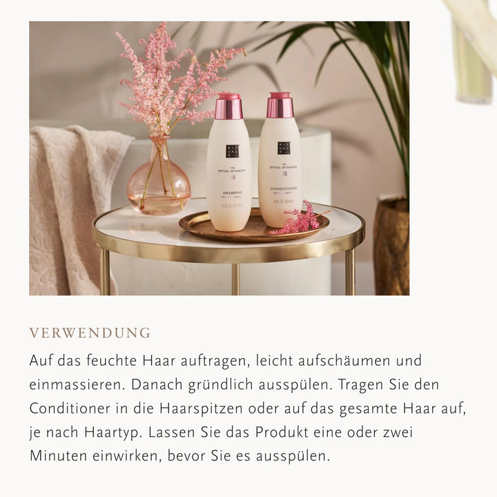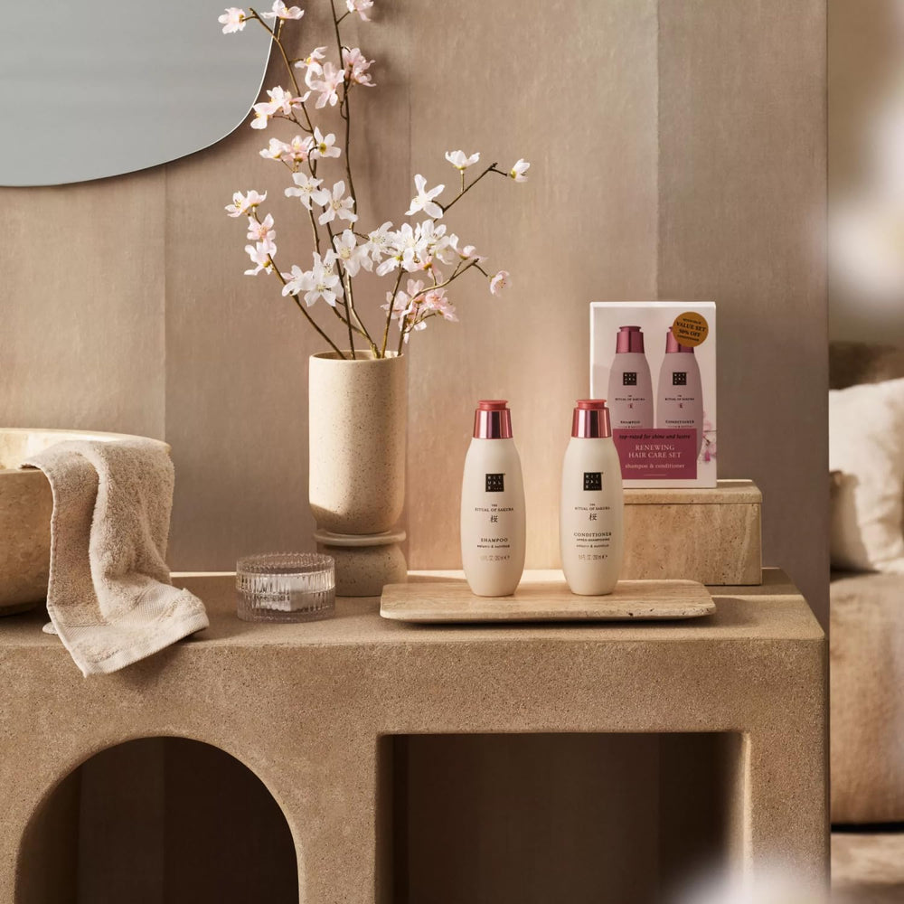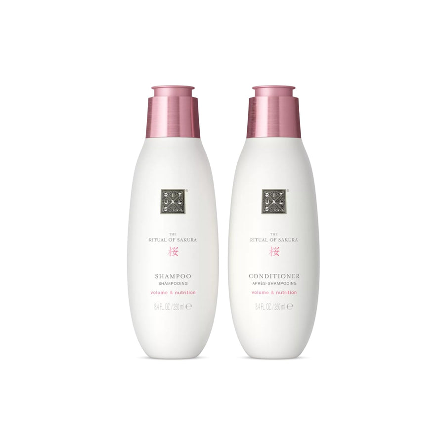 - The Ritual of Sakura: Inspiriert von der japanischen Tradition Hanami, lädt dieses Set aus Volumen Shampoo und Conditioner mit seinem zarten, süsslichen Duft ein, jeden Tag wie einen Neubeginn zu feiern.