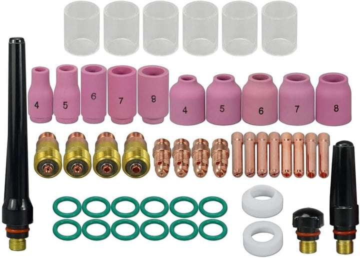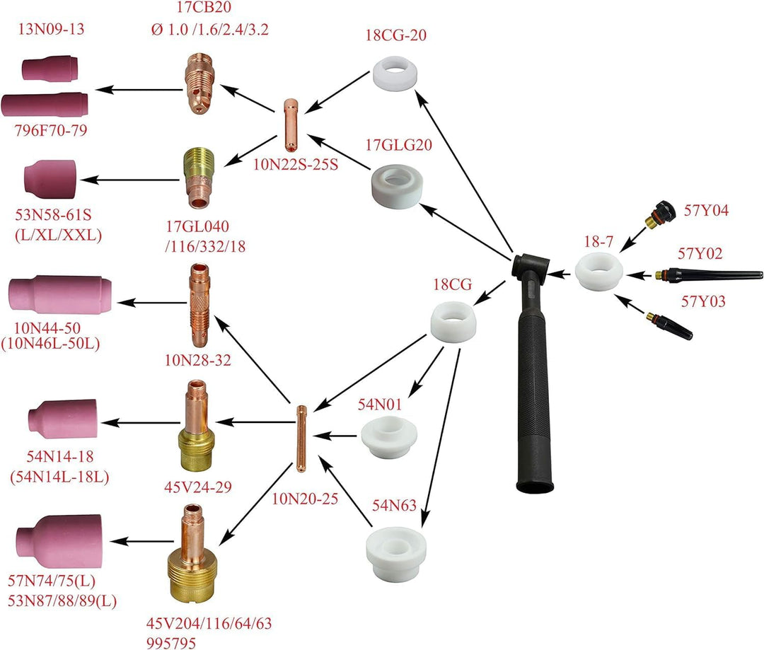 - Jede Grösse für WIG-Gaslinsenisolator 17GLG20, Becherdichtung 18CG-20 und WIG-Rückkappe 57Y02 lang, 57Y03 mittel, 57Y04 kurz hinterer Becher und 12 temperaturbeständige O-Ringe
