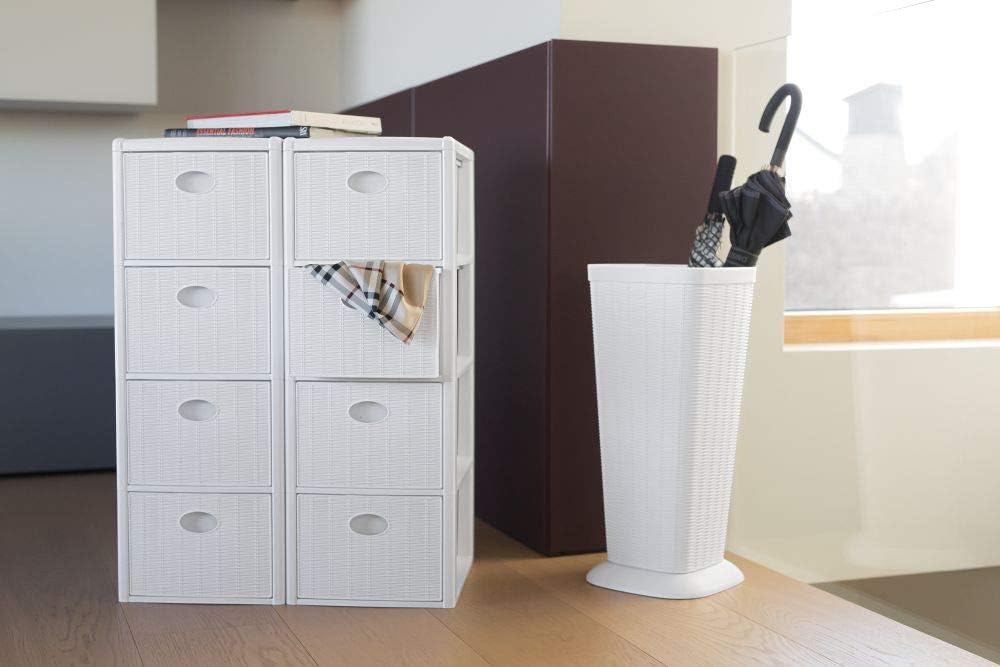 - Rollbarer Schubladenschrank in toller Geflecht-Optik in klarem, reinen Weiss! Mit vier gleichgrossen Schubladen sowie optional zu montierenden Rollen. Hochwertig in Optik und Verarbeitung. Optimal geeignet für den Haushalt, das Badezimmer oder in