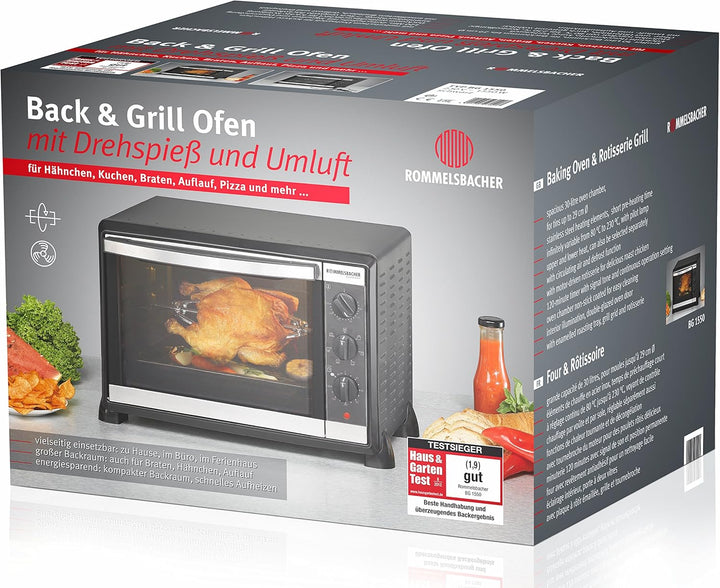 - Inklusive: Drehspiess-Garnitur mit separatem Griff, emailliertes Brat-/Backblech mit separatem Handgriff, verchromter Grillrost, entnehmbares Krümelblech