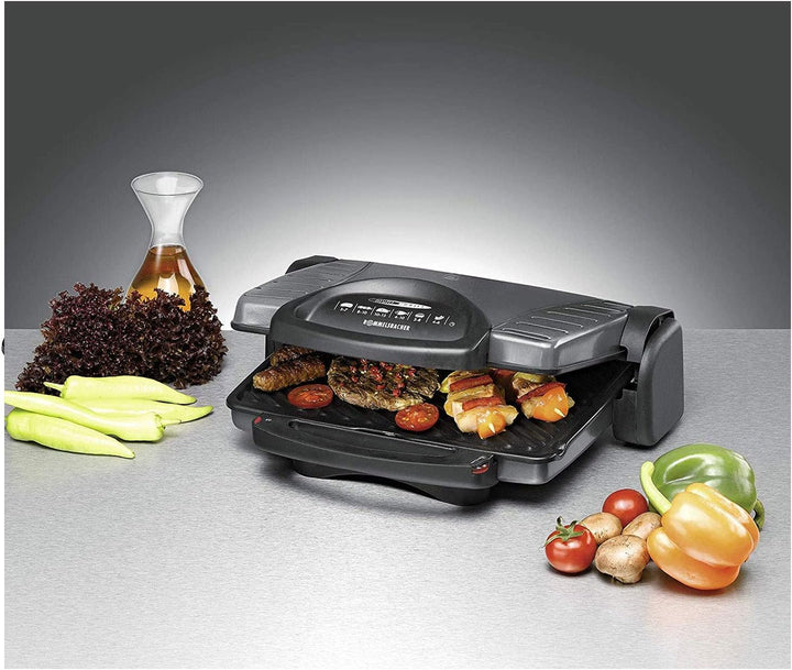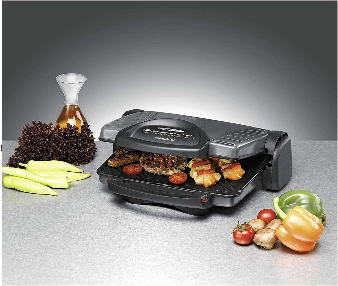 - Variable Anwendungsmöglichkeiten: als Kontaktgrill in geschlossenem Zustand, als Tisch- und Partygrill mit aufgeklappten Grillflächen, zum Überbacken mit arretierter oberer Grillplatte
