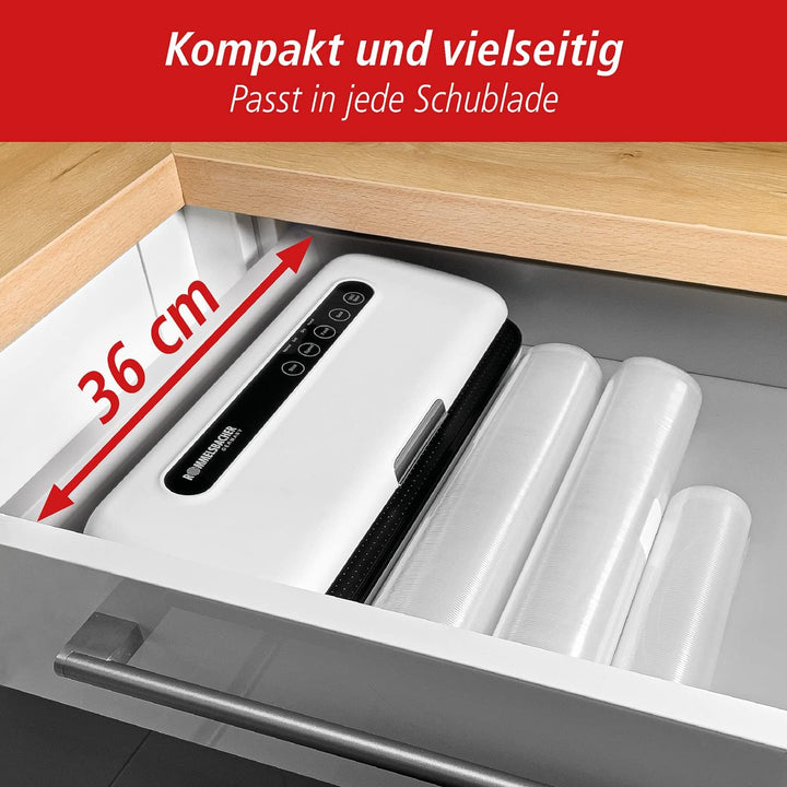 - Vakuumierer saugt bis zu 97% der Luft ab für eine viel längere Haltbarkeit der Lebensmittel