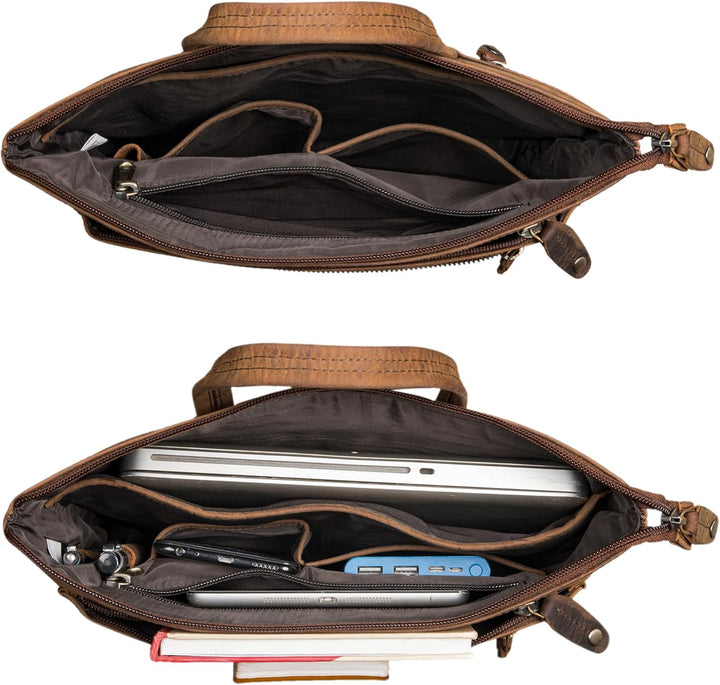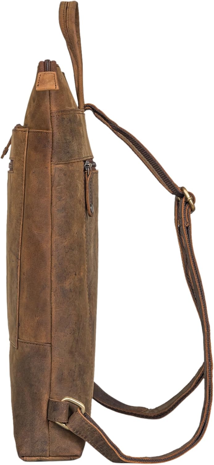 PRODUKTBESCHREIBUNGEN Flacher Design Laptop Rucksack auch Echtleder In einer Welt, in der Mobilität und Stil Hand in Hand gehen, ist dieser flache Laptop-Rucksack aus echtem Leder im Vintage-Look ein Muss für den anspruchsvollen Mann von heute. Dieser exquisit gestaltete Rucksack vereint Ästhetik und Funktionalität und eignet sich perfekt für Laptops bis 15,6 Zoll. Der Laptop-Rucksack besticht durch seinen zeitlosen Vintage-Look, der sowohl Damen als auch Herren anspricht. Das echte Leder verleiht dem Rucksack nicht nur eine ansprechende Ästhetik, sondern sorgt auch für Langlebigkeit und Strapazierfähigkeit. Die dezente Farbpalette passt zu verschiedenen Outfits und Anlässen, vom Geschäftstermin bis zum lässigen Wochenendausflug. Der verstellbare Schultergurt ermöglicht optimalen Tragekomfort, egal ob die Tasche über der Schulter oder als Umhängetasche getragen wird. Das unauffällige, flache Reissverschlussfach auf der Rückseite bietet eine diskrete Möglichkeit, wichtige Dokumente oder Wertsachen unterwegs sicher zu verstauen. Im Inneren schafft eine durchdachte Aufteilung Ordnung. Das Hauptfach bietet ausreichend Platz für Bücher, Notizbücher oder Kleidung. Das zusätzliche Notebookfach schützt Ihr Notebook vor Stössen und Kratzern und hält es sicher an seinem Platz. Zusätzliche Innenfächer bieten noch mehr Stauraum und Organisationsmöglichkeiten. Zwei Stiftehalter sorgen dafür, dass Schreibutensilien immer griffbereit sind. Ein seitliches Reissverschlussfach bietet Platz für Kleinteile wie Schlüssel oder Portemonnaie. Zwei weitere Fächer bieten Platz für Smartphone, Powerbank oder ähnlich grosse Geräte. Alles in allem verkörpert dieser flache Laptop-Rucksack aus echtem Leder in Vintage-Optik die Verschmelzung von zeitloser Eleganz und moderner Funktionalität. Er ist der ideale Begleiter für Frauen und Männer, die Stil und Organisation schätzen. Mit einem Fassungsvermögen, das perfekt auf Mehr