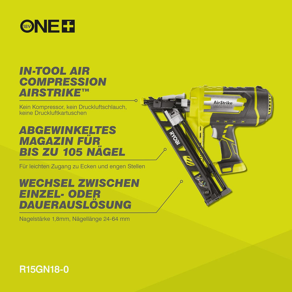 RYOBI 18 V ONE+ Akku-Nagler R15GN18-0 (Nageltyp 1,8 mm, Magazinkapazität von 105 Nägeln, 33-35° Maga